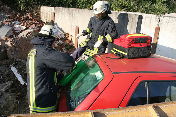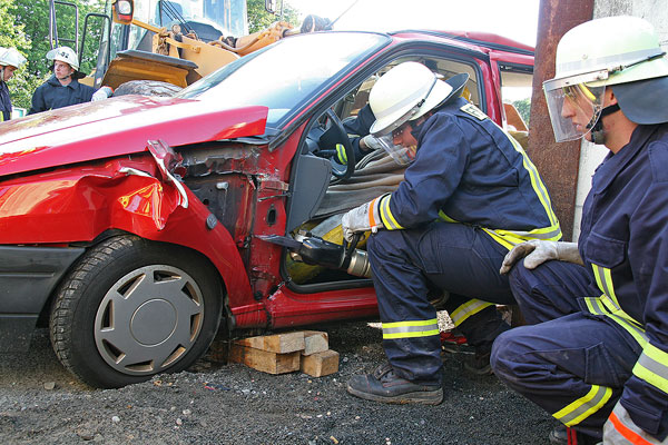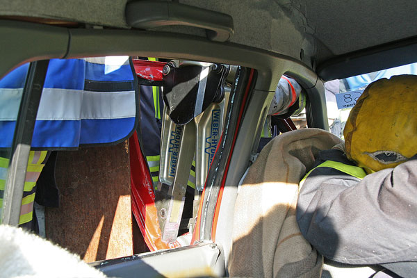 [left][cmsimg]2711[/cmsimg][/left]Nachdem ein Sanitäter der Feuerwehr hineingeklettert und die Erstversorgung der Verletzten vorgenommen hatte, konnte die Rettung beginnen. Eine hinten sitzende Person konnte mit einem Rettungsbrett durch die Heckscheibe ins Freie gebracht werden, doch der Fahrer war eingeklemmt. Um ihn zu befreien, musste die Fahrertür mit hydraulischen Werkzeugen entfernt werden.