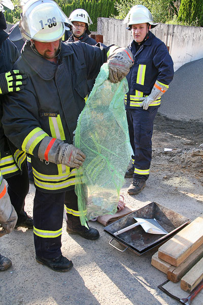 Wichtig bei einem solchen Einsatz ist es, dass die Verletzten nicht unnötig bewegt werden, um weitere Verletzungen zu vermeinden. Dazu müssen auch Erschütterungen während der Rettung verhindert werden. Deshalb schied ein Wegfahren des Baggers aus, da sich der Pkw dadurch unkontrolliert bewegen würde. Nachdem beide Fahrzeuge mit Holz unterbaut und gesichert waren, musste ein Zugang zu den Eingeschlossenen geschaffen werden. Dazu musste die Heckscheibe des Fahrzeugs entfernt werden.
