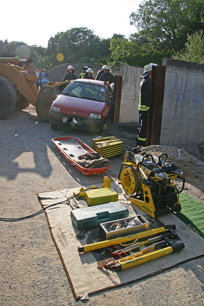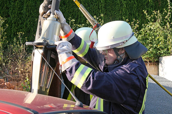 Besonders für die jungen Kameraden war es eine lehrreiche Übung. Sie konnten zum ersten Mal mit den hydraulischen Rettungsgeräten arbeiten, immer unter fachkundiger Anleitung von erfahrenen Einsatzkräften. Das war keine leichte Aufgabe für die jungen Feuerwehrleute, denn trotz des hohen Gewichts der Werkzeuge mussten die Schnitte mit der Schere und die Ansatzpunkte für den Spreizer sitzen. Denn nicht an jeder Stelle kann geschnitten werden: Verstärkter Stahl und verdeckt eingebaute Druckluftpatronen für den Airbag müssen berücksichtigt werden.