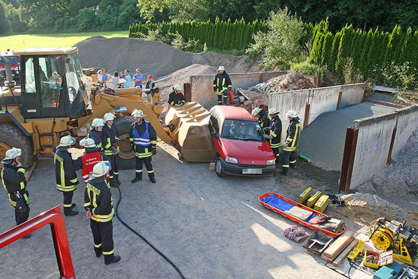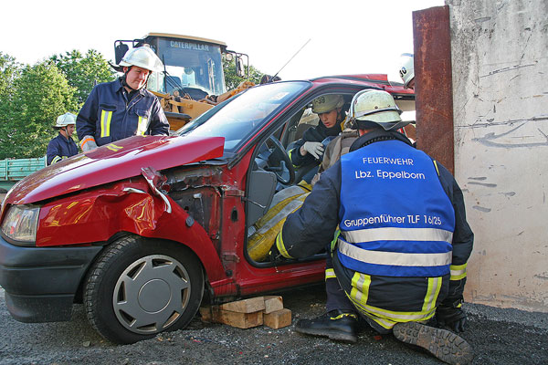 Ein Bagger hat einen Pkw gerammt und gegen eine Wand gedrückt, die beiden Fahrzeuginsassen sind verletzt und eingeklemmt. Mit dieser Ausgangslage wollte der Löschbezirk Eppelborn am 16. Juni 2009 die patientengerechte Rettung von Personen aus einem Fahrzeug trainieren. Vorbereitet wurde die Übung bei der Firma Gihl im Ortsteil Bubach-Calmesweiler, die ihr Firmengelände für diese Übung zur Verfügung gestellt hatte.