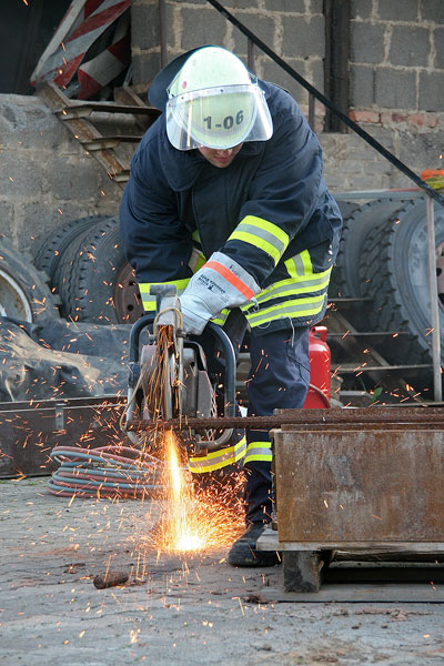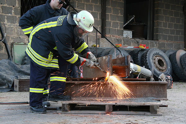 Neben den hydraulischen Rettungsgeräten bot sich das Firmengelände an, den Einsatz weiterer Gerätschaften wie Trennschneider und Motortrennschleifer zu trainieren. Auch hier konnte unter Anleitung erfahrener Metallbauer die korrekte und sichere Handhabung gelernt werden, um die Geräte im Einsatz richtig anwenden zu können.