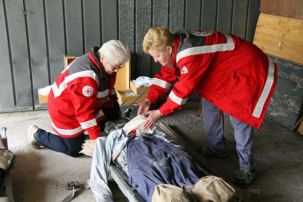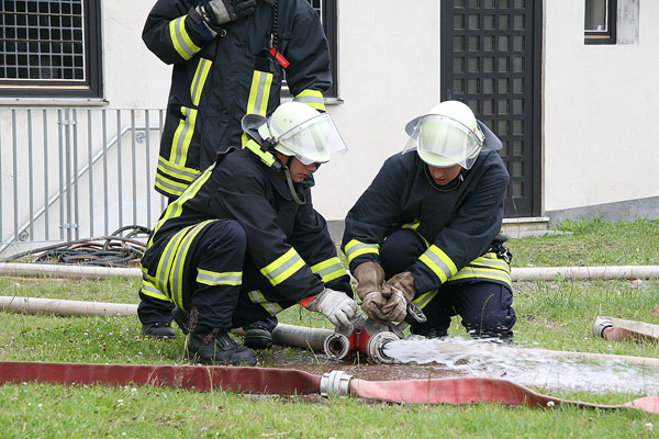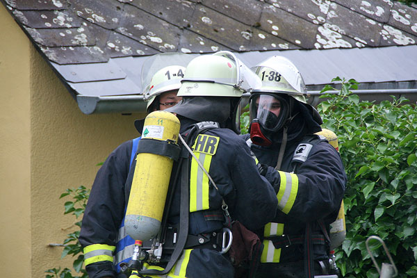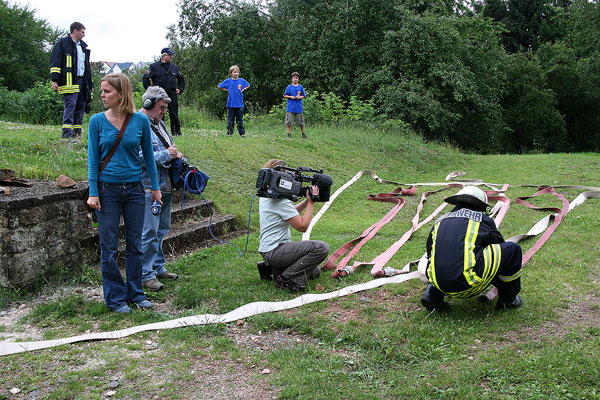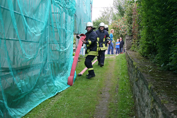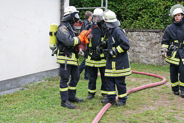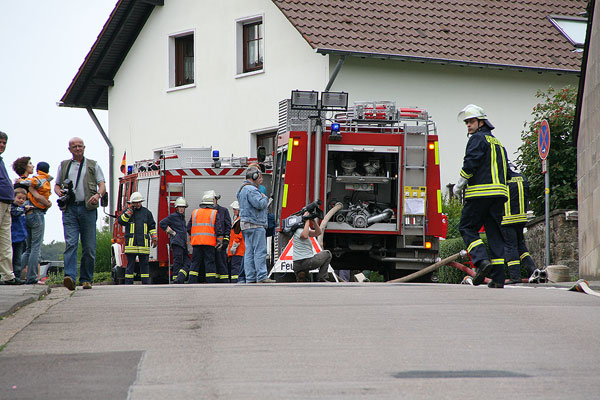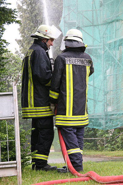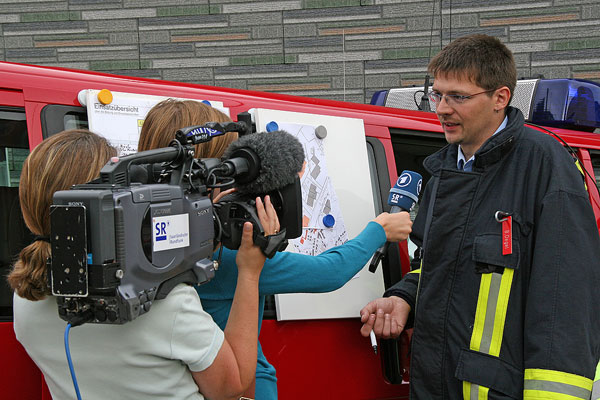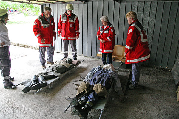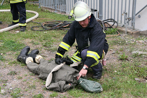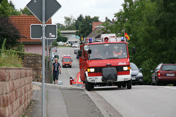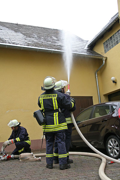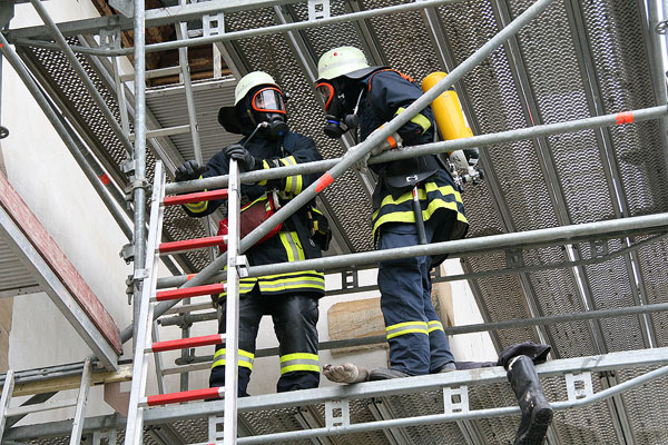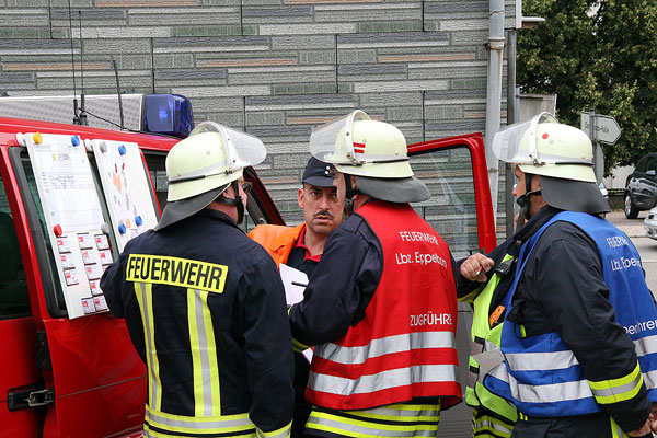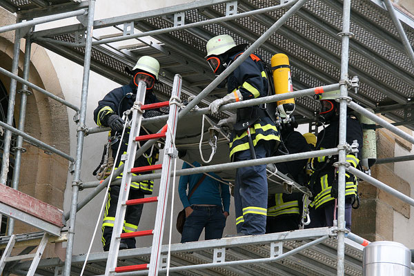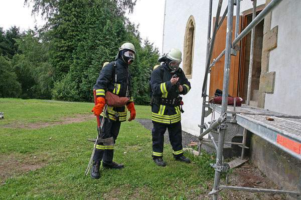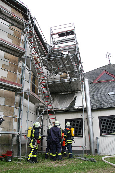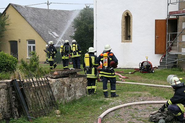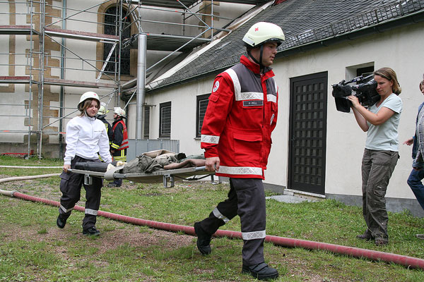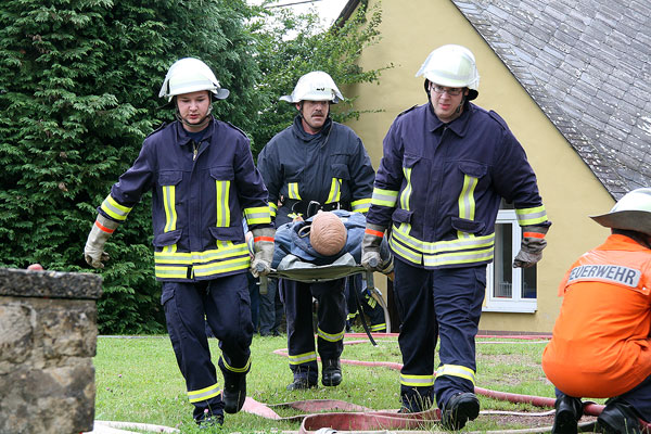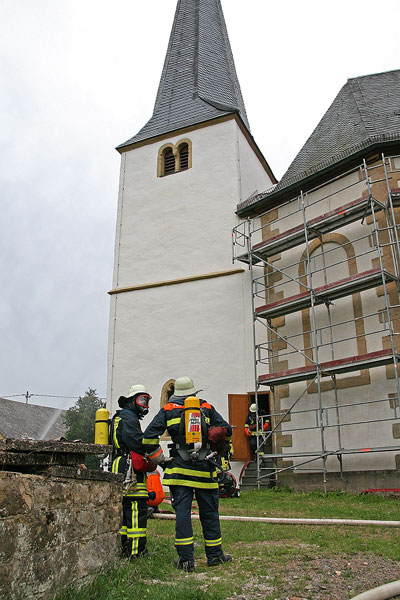 Es war kurz nach 17:00 Uhr, als am 17. Juli 2009 in Thalexweiler die Sirenen aufheulten. Es war der Auftakt zur jährlichen landkreisübergreifenden Großübung, die in diesem Jahr im Bereich der Pfarrkirche in Thalexweiler stattfand. Auch bei den Feuerwehrleuten in Eppelborn, Hasborn und Sotzweiler riefen kurz darauf die Meldeempfänger zum Einsatz. Sie wurden kurz nach Ankunft der ersten Kräfte als Unterstützungseinheiten vom Einsatzleiter nachgefordert. Zahlreiche Schaulustige hatten sich bereits an der Pfarrkirche im Lebacher Stadtteil Thalexweiler versammelt und warteten auf die ersten Helfer. Grund für den Großalarm war ein angenommener Brand im Glockenturm der Kirche. Herabstürzende, brennende Trümmer hatten auch das in unmittelbarer Nähe liegende Pfarrheim in Brand gesetzt, erfuhren die anrückenden Einsatzkräfte von der Einsatzleitung. Von ihr bekamen sie auch ihren jeweiligen Einsatzauftrag. Die Aufgaben waren vielfältig: Während die ersten Trupps in den verrauchten Glockenturm der Pfarrkirche vordrangen, musste auch das Pfarrheim nach eingeschlossenen Personen abgesucht werden. Denn fünf Menschen wurden in den brennenden Gebäuden vermisst. Vor allem aber musste eine zusätzliche Wasserversorgung aus der Theel bis zur Einsatzstelle aufgebaut werden. Dabei wurden Schlauchleitungen auch über die stark befahrene Ortsdurchfahrt gelegt. Die geretteten Peronen, die von den vorgehenden Trupps schnell gefunden wurden, wurden den Helfern des DRK übergeben, die ebenfalls zur Übung angerückt waren. Sie hatten in einer Garage eine Verletztensammelstelle eingerichtet und übernahmen dort die weitere medizinische Versorgung. [left][cmsimg]2798[/cmsimg][/left]Als besonders aufwändig stellte sich die Rettung eines Arbeiters heraus, der bewusstlos auf dem Baugerüst aufgefunden wurde, das an der Kirche aufgebaut war. Aus einer Krankentrage, einer Steckleiter und mehreren Leinen musste ein sogenannter Leiterhebel gebaut werden, um die Person schonend zu retten. Keine leichte Aufgabe unter der beschränkten Sicht durch die Atemschutzmasken. Insgesamt waren die Planer der Übung mit der Leistung der Einsatzkräfte sehr zufrieden. Kleinere Probleme, die aufgetreten waren, wurden in einer Nachbesprechung der Führungskräfte im Anschluss an die Übung angesprochen. Während der gesamten Übung begleitete ein Kamerateam des saarländischen Rundfunks jeden Handgriff der Einsatzkräfte. Insgesamt waren bei der Großübung in Thalexweiler 65 Feuerwehrleute aus vier Feuerwehren und 12 Helfer des DRK eingesetzt. Ziel dieser Übung, die jährlich stattfindet ist die Verbesserung der Zusammenarbeit der beteiligten Wehren, deren Einsatzgebiete aneinander angrenzen.