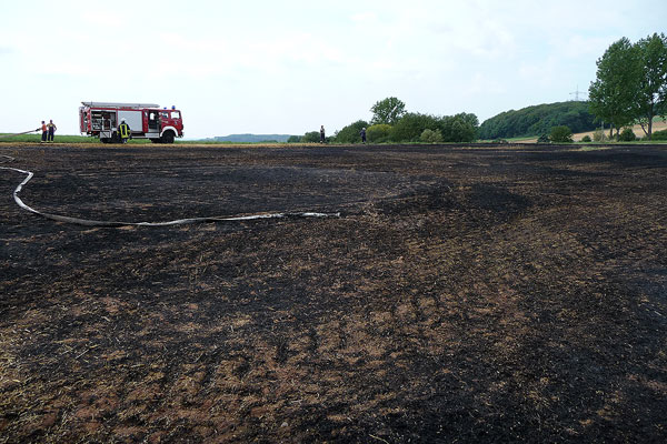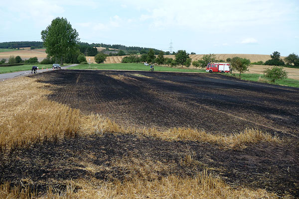 Beim Eintreffen der Einsatzkräfte aus dem Löschbezirk Wiesbach, die gegen 13:19 Uhr alarmiert worden waren, stand das Feld auf einer Fläche von rund 20 mal 30 Meter in Brand. Flammen schlugen, angefacht vom starken Wind bereits über die Straße hinweg.