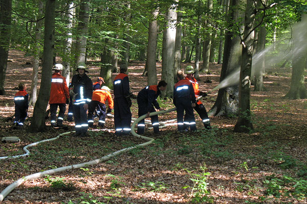 Im Laufe der Löscharbeiten wurde vom Einsatzleiter der sofortige Rückzug befohlen, da der simulierte Brand durchbrach. Sofort verließen die Einsatzkräfte ihre Positionen und sammelten sich an ihren Fahrzeugen. Jetzt erfolgte eine neue Befehlsausgabe der Einheitenführer. An einer schmalen Stelle im angenommenen Schadensgebiet wurde ein Durchbrechen des Feuers durch massiven Wassereinsatz verhindert. Somit war das Übungsziel erreicht.