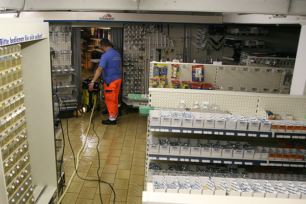 Die Angestellten eines Warenhauses in der Eppelborner Ortsmitte bemerkten bei Arbeitsbeginn am Morgen des 01. September 2009, dass die Kellerräume stiefeltief unter Wasser standen. Ursache für den Wasseraustritt war offensichtlich ein Defekt an der Heizungsanlage des Hauses. Auf rund 550 Quadratmetern hatte sich das Wasser ausgebreitet. Um den Wassermassen Herr zu werden, wurde gegen 08:58 Uhr die Feuerwehr alarmiert. Mit einer Tauchpumpe und Wassersaugern, die aus dem Löschbezirk Bubach-Calmesweiler und aus dem Eppelborner Hallenbad angefordert wurden, konnte das Wasser von den Einsatzkräften aus dem Löschbezirk Eppelborn abgesaugt werden. Der Einsatz der Feuerwehr dauerte bis gegen 13:45, bevor die Räume an den Eigentümer übergeben werden konnten. Als Problem erwies sich bei dem Einsatz die Verkehrssituation am Wochenmarkt in der Eppelborner Ortsmitte. Durch die zahlreichen Marktstände gibt es für die Fahrzeuge von Feuerwehr und Rettungsdienst im Ernstfall kein Durchkommen.
