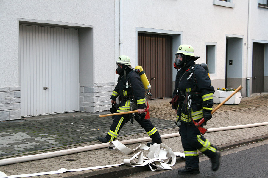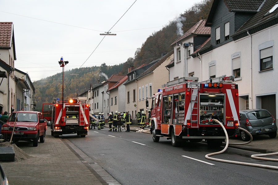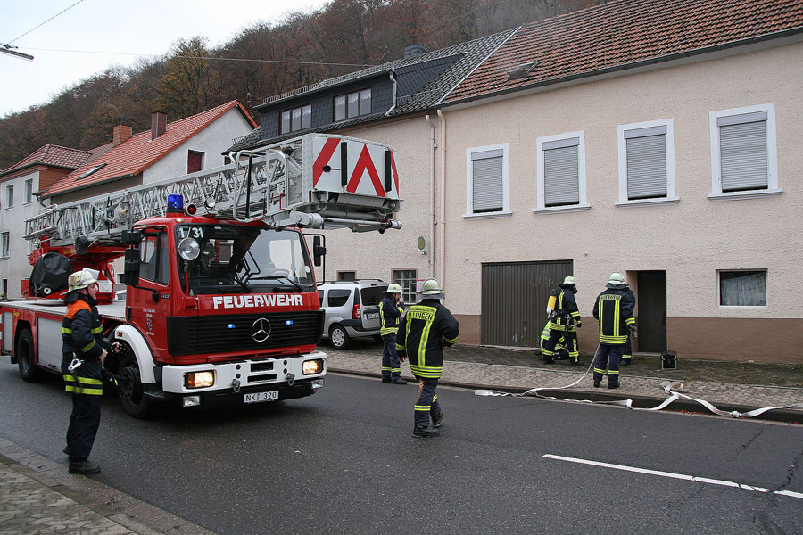 Große Aufregung herrschte am Nachmittag des 10. November 2009 in der Kossmannstraße in Eppelborn: Nachbarn hatten bemerkt, wie Brandrauch aus dem Dach eines Wohnhauses hervordrang und sofort die Feuerwehr gerufen. Gegen 15:56 Uhr wurde daraufhin Alarm für die Löschbezirke Eppelborn und Bubach-Calmesweiler ausgelöst. Gleichzeitig machte sich auch die Drehleiter aus Illingen mit dem Einsatzstichwort "Wohnhausbrand" auf den Weg zur Einsatzstelle. Beim Eintreffen der ersten Einsatzkräfte an dem zweigeschossigen Wohnhaus hielt sich der dort allein lebende Anwohner noch in dem Gebäude auf und hatte die Gefahr durch Feuer und Rauch noch nicht realisiert. Er konnte von der Feuerwehr ins Freie gebracht werden, bevor mit Atemschutzgeräten ausgerüstete Trupps in das Gebäude vordrangen. Umständlich gestaltete sich bei dem Einsatz die Löschwasserversorgung: Der nächstgelegene Hydrant war durch einen Anwohner zugeparkt und konnte erst genutzt werden, als dieser sein Fahrzeug weggefahren hatte. [left][cmsimg]3022[/cmsimg][/left]Der Brandherd konnte schließlich im Keller des Hauses lokalisiert und gelöscht werden. Der Anwohner blieb unverletzt und wurde nach einer ersten Untersuchung von Rettungssanitätern der Feuerwehr betreut. Durch die aufmerksame Reaktion der Nachbarn und den schnellen Einsatz der Feuerwehr konnte ein Ausbreiten des Brandes verhindert werden. Während der Löscharbeiten musste die stark befahrene Kossmannstraße für den Verkehr voll gesperrt werden. Die Einsatzstelle wurde nach Abschluss der Löscharbeiten an die Polizei übergeben, die auch für eine Unterbringung des Bewohners sorgte, da die Wohnräume durch den Brandrauch in Mitleidenschaft gezogen wurden.