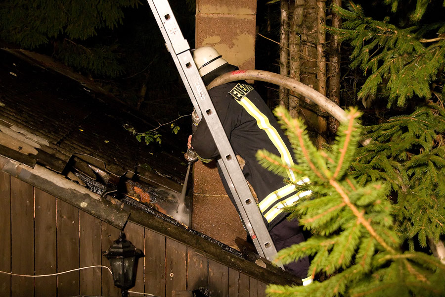 Beim Eintreffen der Einsatzkräfte war es dem Eigentümer bereits gelungen, die Flammen zu ersticken. Doch zwischen Verkleidung und Dachziegeln und im Innern der mit Holz erbauten Hütte schwelte das Feuer weiter. Ausgerüstet mit Atemschutzgeräten drang ein Trupp in das verrauchte Gebäude vor und löschte die Glutreste im Innenbereich der Hütte. Von aussen wurde die Dachhaut geöffnet, um versteckte Glutnester zu finden und abzulöschen.