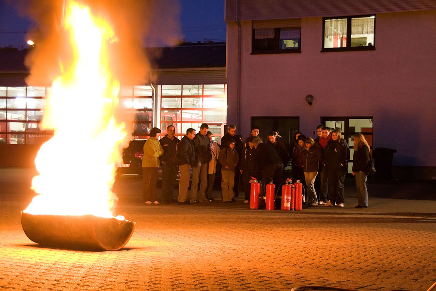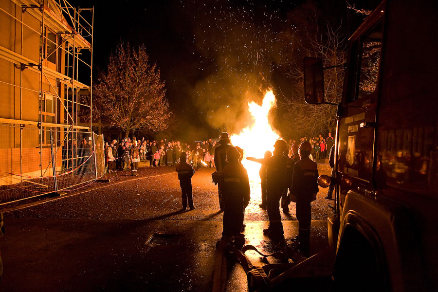 Meterhoch schießt die Stichflamme in den Himmel vor dem Feuerwehrgerätehaus in Eppelborn. Gerade hat ein…
