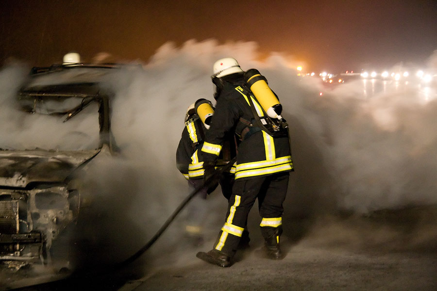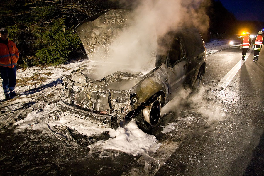 Beim Eintreffen der Feuerwehr brannte das Fahrzeug im vorderen Bereich unter starker Flammenbildung und Rauchentwicklung. Die Flammen hatten bereits auf den Fahrgastraum übergegriffen. Unter Atemschutzeinsatz konnte das Feuer mit Löschschaum schnell gelöscht werden. Heiße Karosserieteile wurden anschließend mit Wasser gekühlt, um ein erneutes Aufflammen zu verhindern. Die Einsatzstelle wurde ausgeleuchtet und gemeinsam mit der Polizei gegen den fließenden Verkehr gesichert.