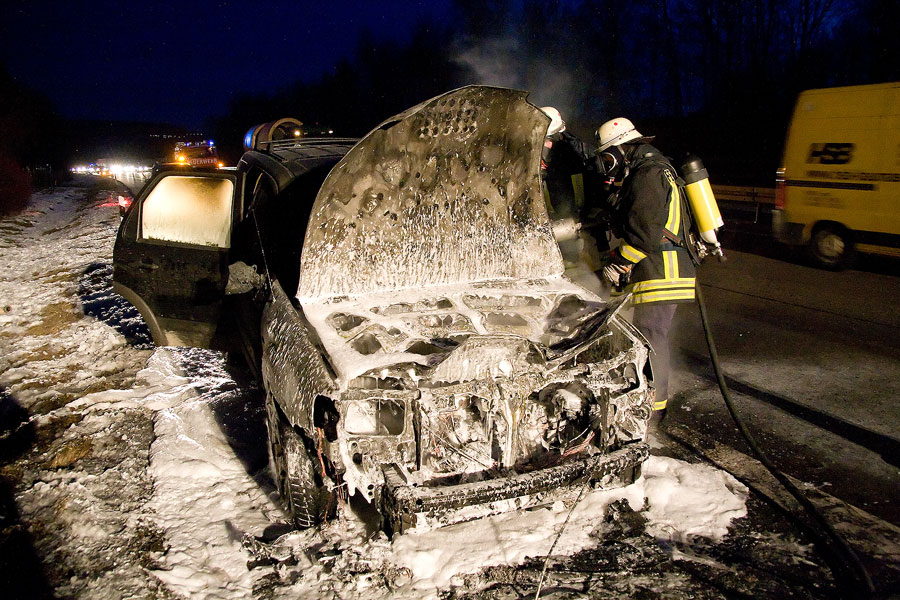 "Fahrzeugbrand auf der Autobahn" hieß es in der Alarmmeldung für den Löschbezirk Eppelborn am Morgen des 10. März 2010, mit der die Männer und Frauen der Feuerwehr Eppelborn gegen 05:55 Uhr zum Einsatz gerufen wurden. Zwischen den Anschlussstellen Eppelborn und Illingen war in Fahrtrichtung Saarbrücken ein Geländewagen in Brand geraten.