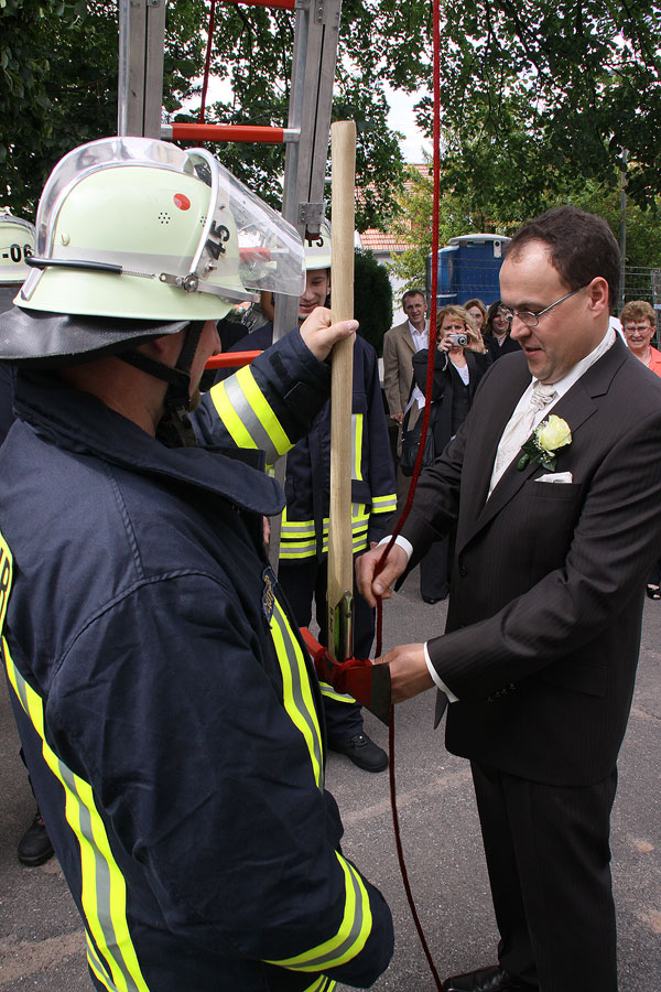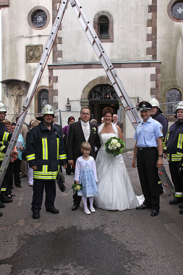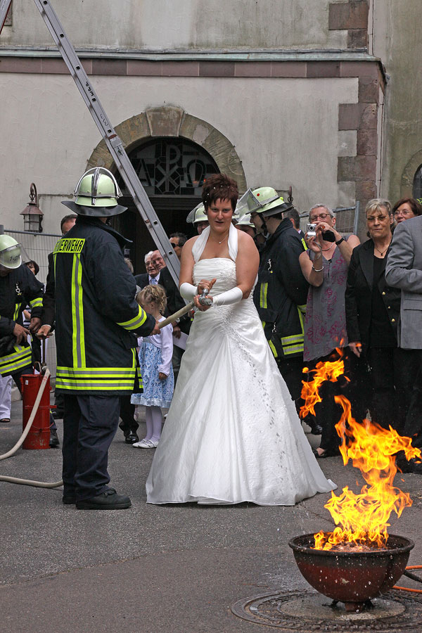 Klar, dass da auch die Kameraden aus dem Löschbezirk Eppelborn nicht fehlen durften. Während der Trauzeremonie hatten sie Aufgaben vor der Kirche vorbereitet, die das Brautpaar nach Feuerwehrtradition bewältigen musste.