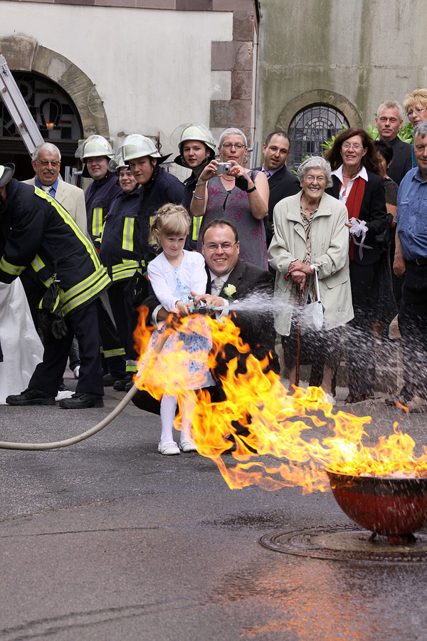 Eine Axt mit einem Knoten an einer Feuerwehrleine zu befestigen, das schaffte der Bräutigam natürlich mühelos. Doch als es dann darum ging, eine Flamme mit der Kübelspritze zu löschen, war Isabelle ihrem Mann überlegen. Der musste sich erst Unterstützung von Töchterchen Hanna holen, ehe der Brand gelöscht werden konnte.