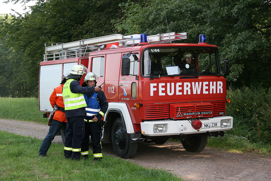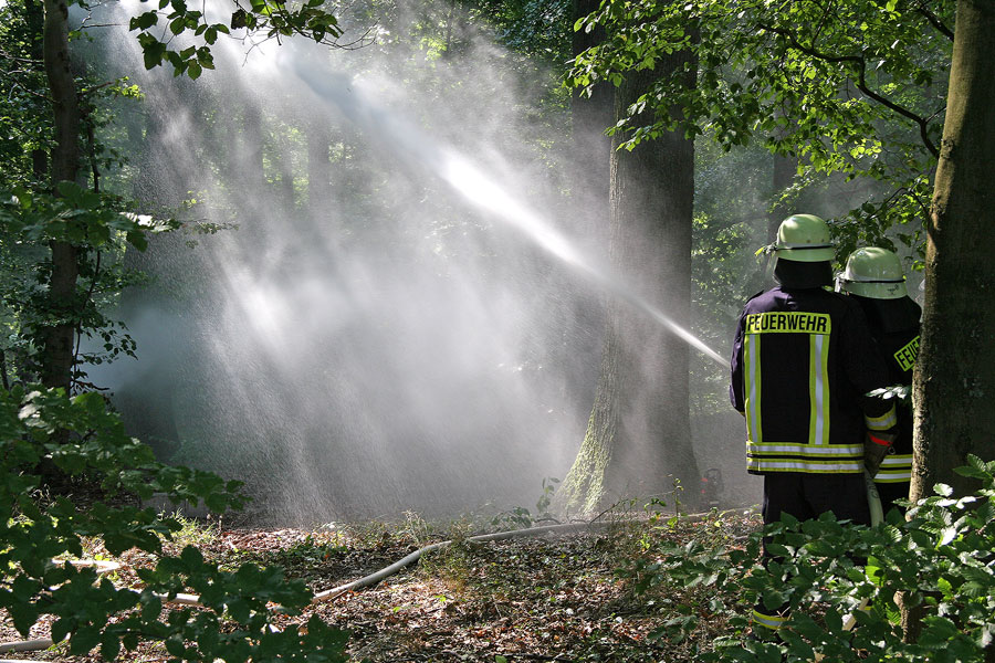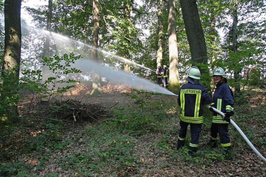 Rauchpatronen wiesen den ersten eintreffenden Kräften den Weg zur Einsatzstelle. Ein Feuer im Unterholz am Waldrand galt es zu bekämpfen, weit ab von jeder Wasserversorgung. Und gleich war klar: Die 2.800 Liter Wasser, die das Tanklöschfahrzeug mitführt, würden nicht ausreichen, um den Brand zu bekämpfen.