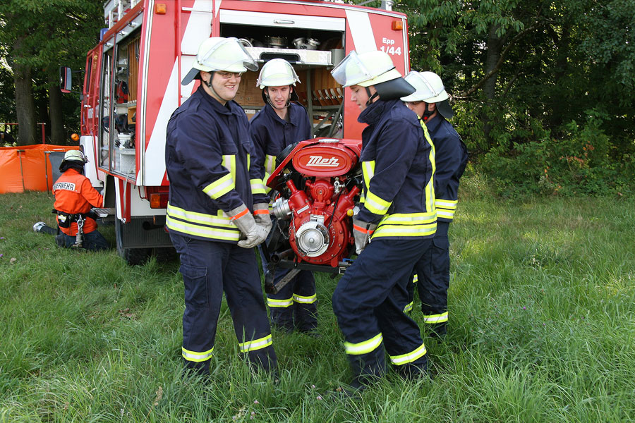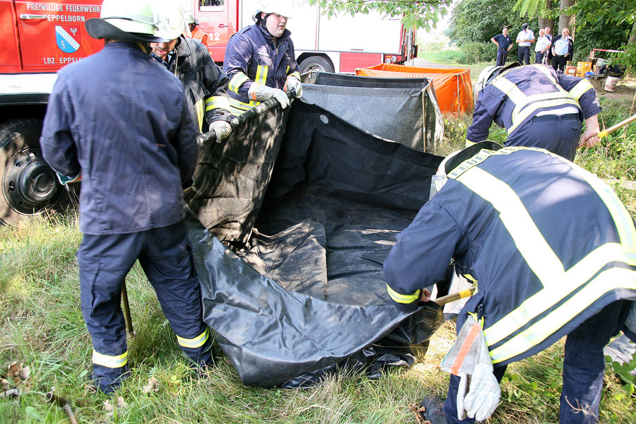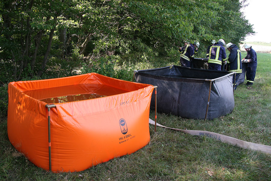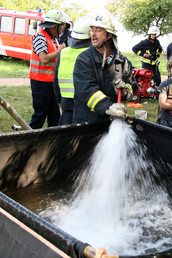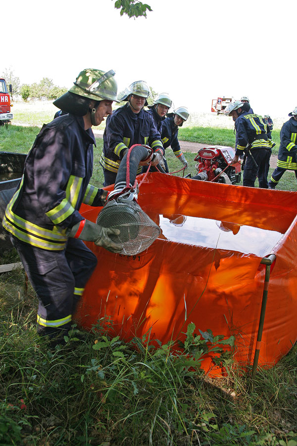 Deshalb musste Wasser über eine größere Entfernung beigeschafft werden. Mit einem Tanklöschfahrzeug wurde ein Pendelverkehr eingerichtet. Als "Zwischenspeicher" dienten vor Ort dabei mehrere Faltbehälter, jeder mit einem Fassungsvermögen von 3.000 Litern. Von dort wurde das Löschwasser mit einer Tragkraftspritze angesaugt und in die Schlauchleitungen der Angriffstrupps gepumpt. "Bei einem realen Einsatz kämen natürlich mehrere wasserführende Fahrzeuge aus der Umgebung mit zum Einsatz", erklärte der stellvertretende Löschbezirksführer Dr. Frank Schwan in der Nachbesprechung zur sehr gut verlaufenen Übung.