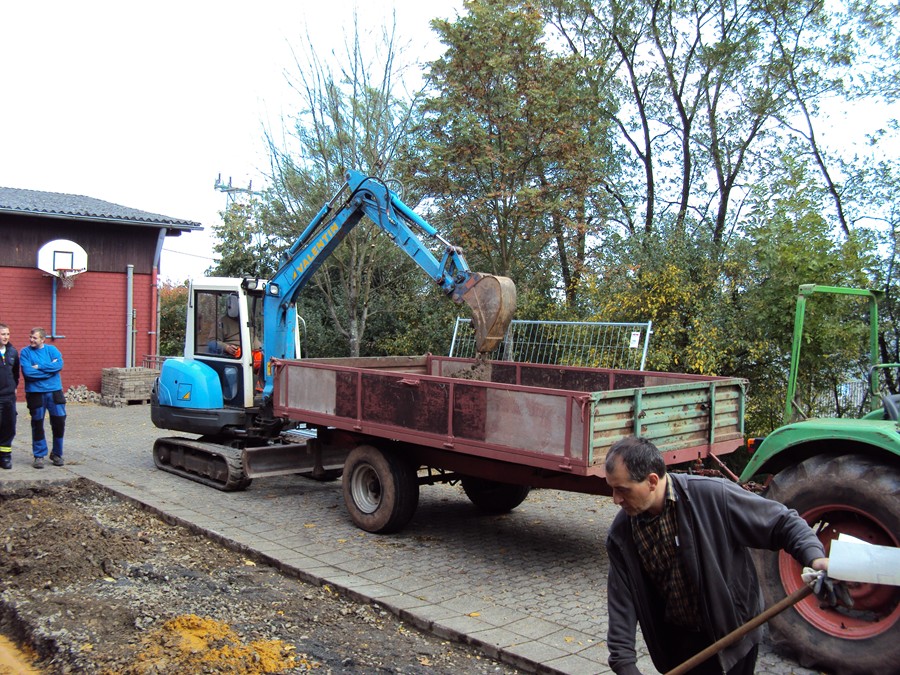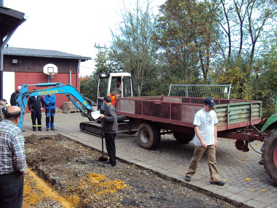 Mit vereinten Kräften vom Löschbezirk Habach und des DRK OV Habach, wurde zuerst ein grpßer Teil der Verbundsteine des Parkplatzes entfernt und die Gräben für die Fundamente des neuen Anbaus, einer Küche für das DRK OV Habach, mit schwerem Gerät ausgehoben.