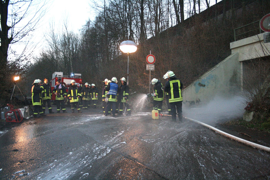 Die Kameradinnen und Kameraden begaben sich zum Übungsobjekt und begannen sofort mit dem Löschangriff unter Atemschutz in dem total verrauchten Tunnel, ein anderer Trupp baute die Wasserversorgung auf und bereitete einen Löschangriff mit Schaum vor.