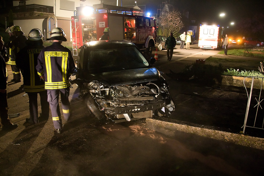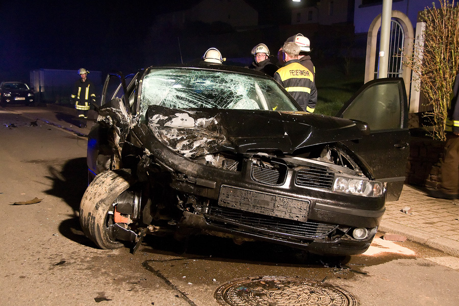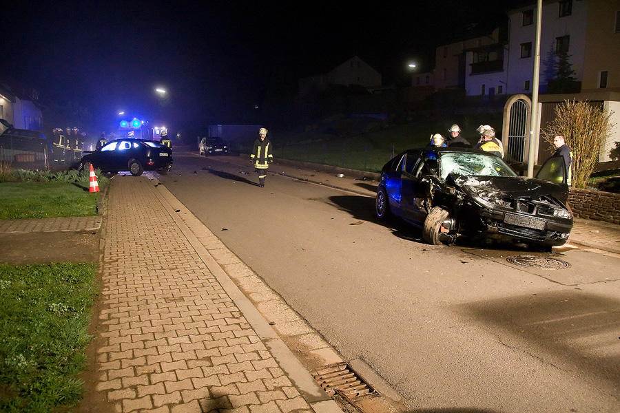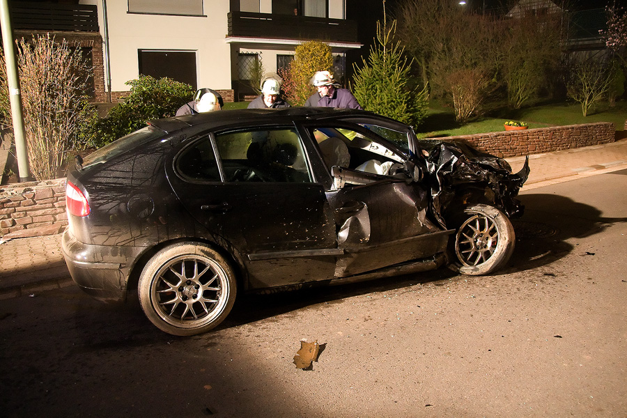 Es muss ein gewaltiger Knall gewesen sein, mit dem die Anwohner der Weihereckstraße im Eppelborner Ortsteil Bubach-Calmesweiler in der Nacht zum 02. April 2011 aufgeschreckt wurden: Offenbar mit hoher Geschwindigkeit war ein mit zwei Personen besetzter Seat auf ein am Fahrbahnrand geparktes Fahrzeug geprallt und gegen eine Mauer geschleudert. Gegen 02:14 Uhr wurden Feuerwehr, Polizei und Rettungsdienst zur Einsatzstelle alarmiert. Den Einsatzkräften bot sich bei der Ankunft ein Bild der Zerstörung: Insgesamt drei Fahrzeuge waren zum Teil erheblich beschädigt, die Fahrbahn war über mehrere Meter mit Trümmerteilen übersät. Die Einsatznachricht "eingeklemmte Personen" bestätigte sich glücklicherweise nicht: Beide Fahrzeuginsassen erlitten bei dem Unfall Verletzungen, konnten aber ohne technisches Gerät aus dem Fahrzeug befreit werden. Sie wurden vom Notarzt vor Ort untersucht und zu weiteren Untersuchungen in ein Krankenhaus gebracht. Die Einsatzkräfte aus dem Löschbezirk Bubach-Calmesweiler, die mit zwei Fahrzeugen im Einsatz waren, leuchteten die Unfallstelle aus und sicherten die Einsatzstelle ab. Auslaufende Kraft- und Betriebsstoffe wurden mit Bindemitteln aufgenommen und die Fahrbahn von Trümmerteilen gereinigt. Warum es zu dem Unfall kommen konnte, ist noch ungeklärt. An zwei Fahrzeugen entstand Totalschaden, ein weiteres Fahrzeug wurde erheblich beschädigt. Die Feuerwehr war mit 21 Einsatzkräfte bis gegen 04:00 Uhr im Einsatz.