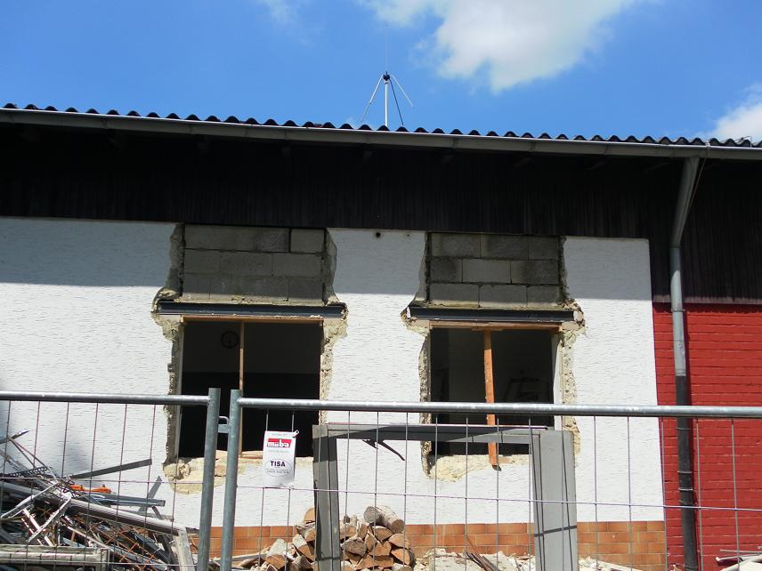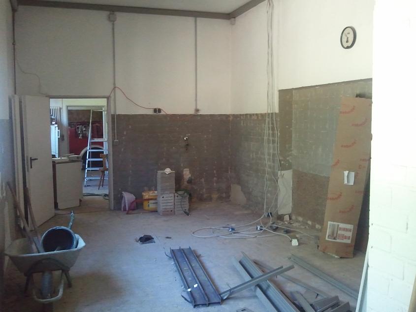 In der alten Küche des DRK wurde alles entrümpelt und die Fliesen von Wand und Boden entfernt, so dass nun Platz für neue Umkleiden und eine Dusche ist. Auch wurden bereits die alten großen Fenster und Türen ausgebaut, da diese zu einem zu großen Wärmeverlust führen. Sie werden nun durch nur ca. halb so große Fenster und Türen ersetzt.