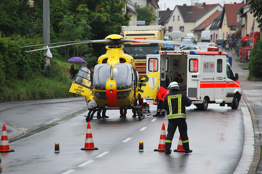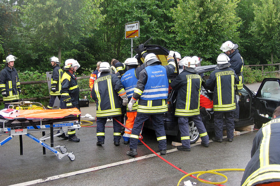 Am 20. Juni 2011 ereignete sich gegen Mittag am Ortsausgang von Eppelborn in Richtung Dirmingen ein schwerer Verkehrsunfall: Der Fahrer eines aus Richtung Dirmingen kommenden VW Golf kam aus noch ungeklärter Ursache auf regennasser Fahrbahn von der Straße ab. Er prallte gegen eine Leitplanke und schleuderte dann im Kurvenbereich in einen entgegenkommenden Lastwagen. Dabei erlitten die beiden über 80jährigen Fahrzeuginsassen zum Teil schwere Verletzungen, konnten sich aber aus eigener Kraft aus ihrem Fahrzeug befreien. Der Fahrer des Lkw blieb bis auf einen Schock unverletzt. Anwohner, die den Unfall bemerkt hatten, sahen den aus dem Motorraum austretenden Rauch und löschten einen Entstehungsbrand mit einem Feuerlöscher. Ein Feuerwehrmann aus dem Löschbezirk Dirmingen, der gerade mit einem Löschfahrzeug an der Unfallstelle vorbeikam, leistete erste Hilfe und betreute zusammen mit Passanten die Unfallbeteiligten. Da die Frau über zunehmende Übelkeit klagte, setzte sie sich wieder in ihren Wagen und wartete dort auf die Rettungskräfte. Die Einsatzkräfte der Feuerwehr aus den Löschbezirken Eppelborn und Bubach-Calmesweiler, die noch vor Polizei und Rettungsdienst an der Unfallstelle eintrafen, sicherten die Unfallstelle und sorgten für den Brandschutz an der Einsatzstelle. Ebenso wurden die Verletzten von medizinischem Fachpersonal der Feuerwehr bis zum Eintreffen des Rettungsdienstes weiter versorgt. Da aufgrund der Beschwerden und dem Verletzungsmuster der Verdacht auf eine Wirbelsäulenverletzung bestand, entschied sich der inzwischen eingetroffene Notarzt für eine aufwendige, aber möglichst schonende Rettung der Patientin. Dafür wurden von der Feuerwehr die hinteren Seitentüren mit hydraulischen Werkzeugen abgetrennt und das Dach des Fahrzeugs abgenommen. Erst dann konnte die ältere Dame aus dem Fahrzeug befreit werden. Der Fahrer wurde zur weiteren Behandlung mit dem Rettungswagen in ein Krankenhaus gebracht, seine Frau musste mit dem Rettungshubschrauber zur Winterbergklinik nach Saarbrücken geflogen werden. Die B10 war wegen den Rettungsarbeiten für rund 90 Minuten voll gesperrt. [iframe width="620" height="349"]https://www.youtube.com/embed/VB9-FHO4VK4?wmode=opaque[/iframe]