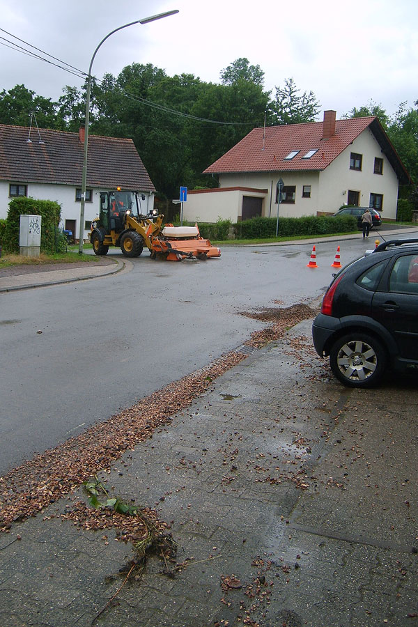 In Dirmingen waren die Straße "Im Nassenbüsch" und zahlreiche Grundstückszufahrten betroffen, wo ebenfalls Schlamm und Geröll auf die Fahrbahn gespült worden war. Auch hier musste die Feuerwehr zusammen mit dem Gemeindebauhof die Fahrbahn reinigen.