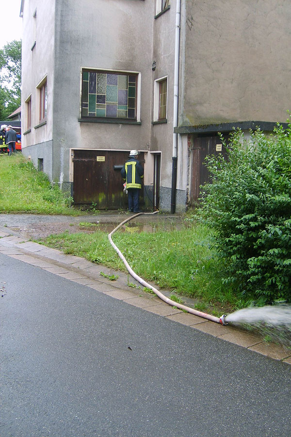 In der Calmesweiler Straße wurde die Feuerwehr aus Bubach-Calmesweiler mit einem Radlader von einer angrenzenden Baustelle unterstützt, um Geröll und Kies von der Fahrbahn zu räumen. Dort war auch Wasser in einen Keller eingedrungen, das von den Einsatzkräften mit einer Tauchpumpe abgepumpt werden musste.