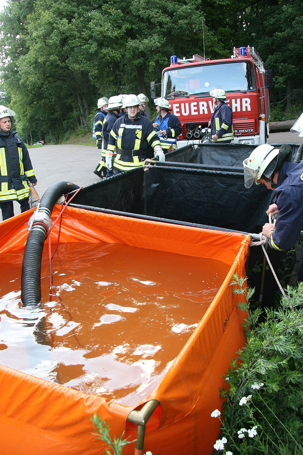Um die Wasserversorgung sicherzustellen, sollte mit Tanklöschfahrzeugen ein sogenannter Pendelverkehr eingerichtet werden. Dazu wurden am Übungsort große, mehrere tausend Liter fassende Faltbehälter aufgebaut, aus denen die Strahlrohre der Löschmannschaften gespeist wurden. Die Tanklöschfahrzeuge entnahmen dazu Löschwasser aus einem Hydranten im Industriegebiet und lieferten ihre nasse Fracht an diesem Übergabepunkt ab.