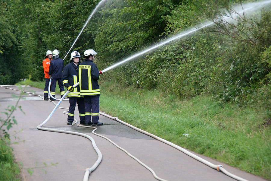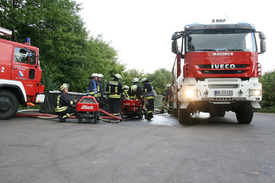 Wasserversorgung weit abseits von Hydranten und offenen Gewässern lautete die Hauptaufgabe bei der diesjährigen "Drei-Landkreis-Übung" in Eppelborn, an der Feuerwehren aus den drei Landkreisen Neunkirchen, Saarlouis und St. Wendel teilnahmen. Dazu wurde ein Waldbrand in der Verlängerung der Galgenbergstraße nahe der Autobahn A1 angenommen.