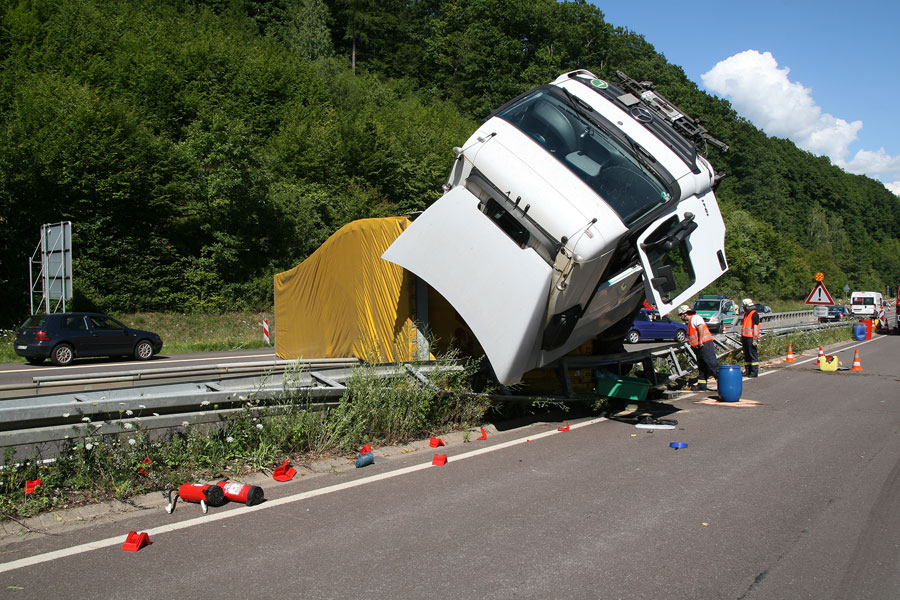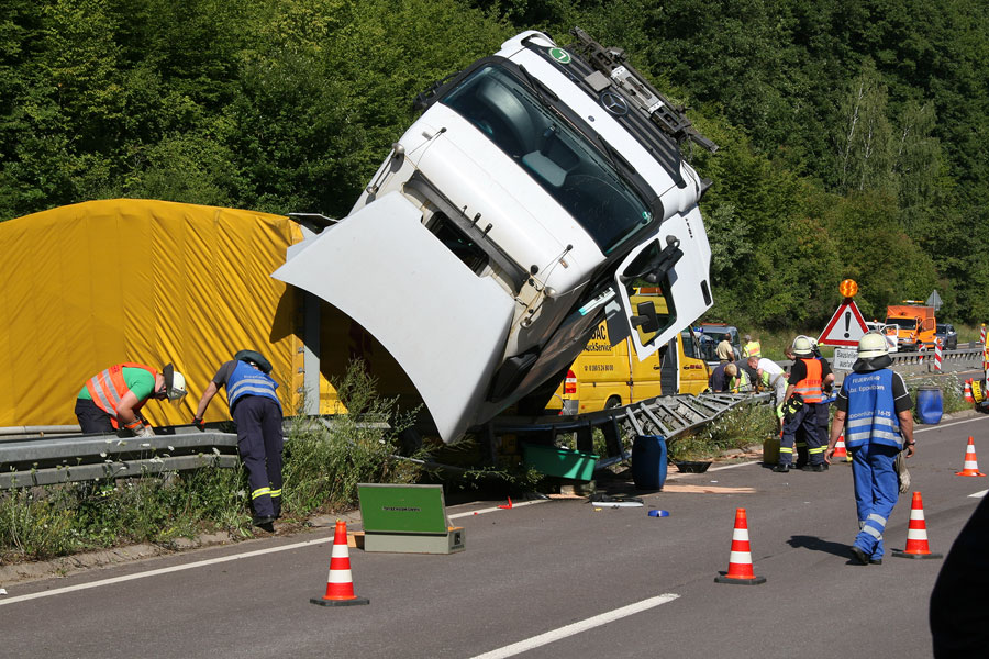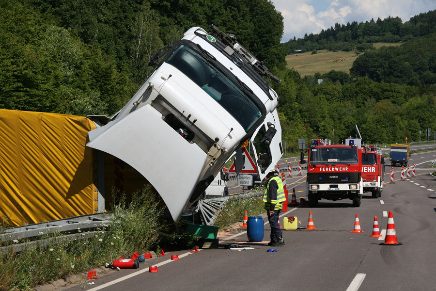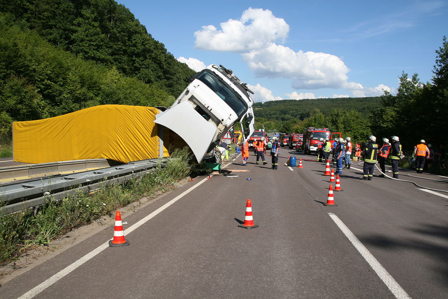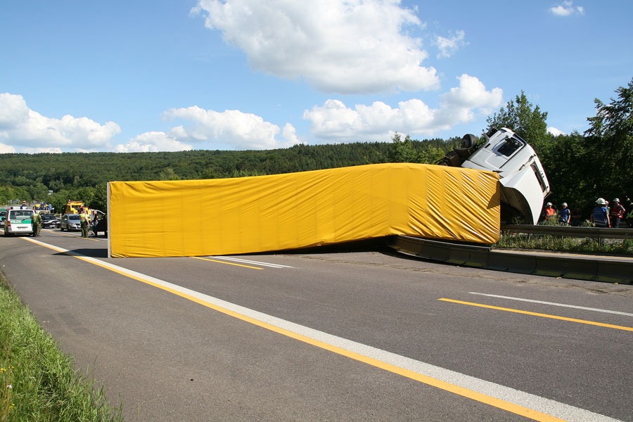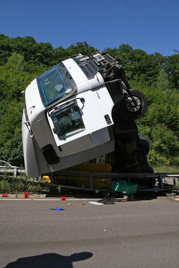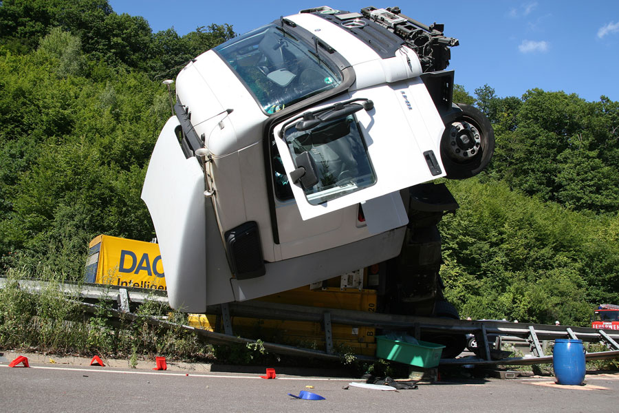 Der Fahrer hatte dabei großes Glück: Er konnte sich unverletzt und aus eigener Kraft aus dem Führerhaus, das senkrecht in den Himmel ragte, befreien. Der Fahrer eines entgegenkommenden Lastzugs erkannte die Situation schnell und konnte rechtzeitig vor der Unfallstelle zum Stehen kommen. Weitere Fahrzeuge wurden nicht in den Unfall verwickelt.
