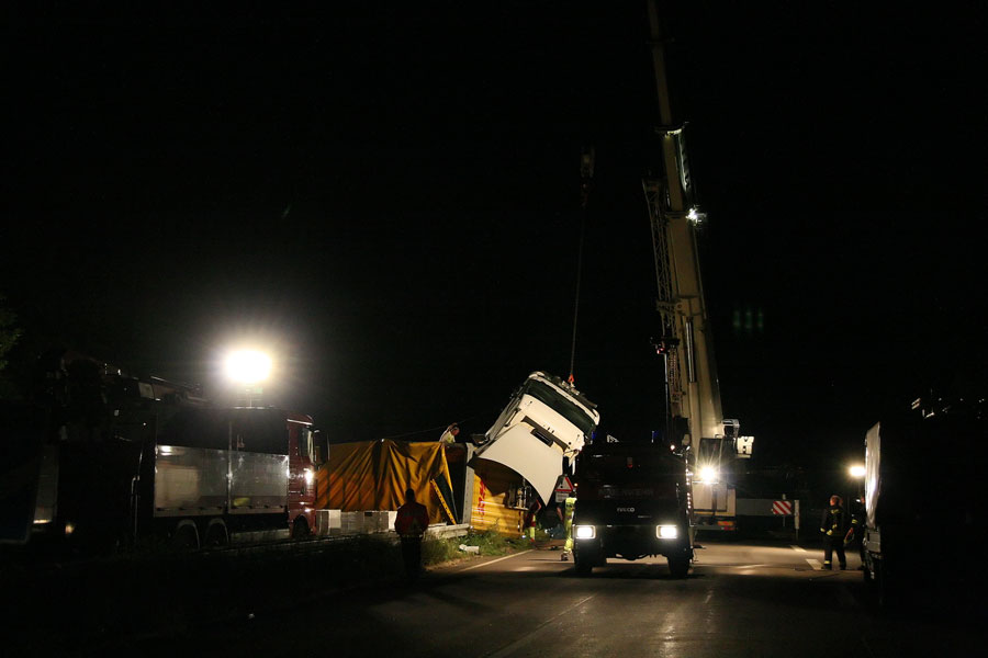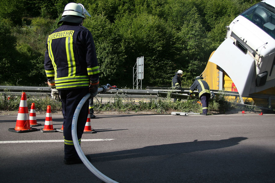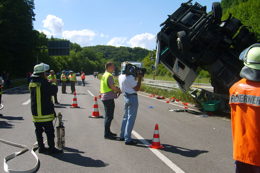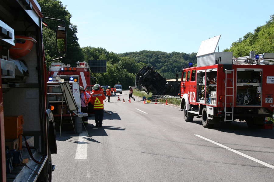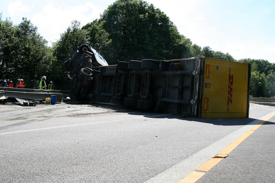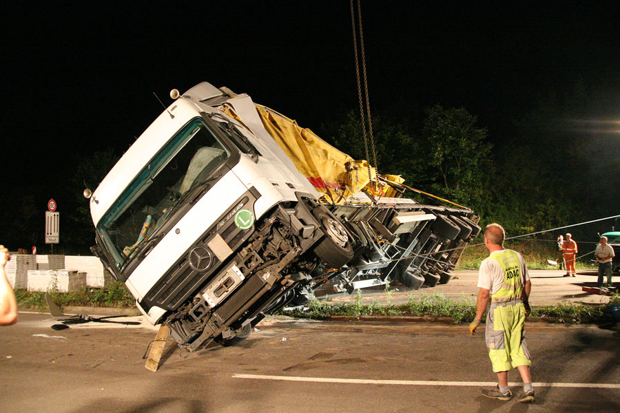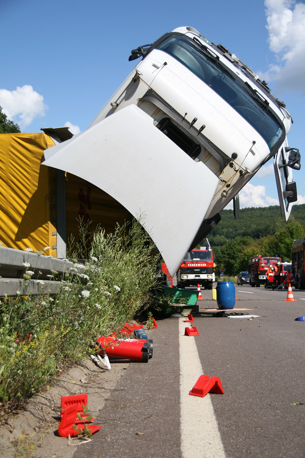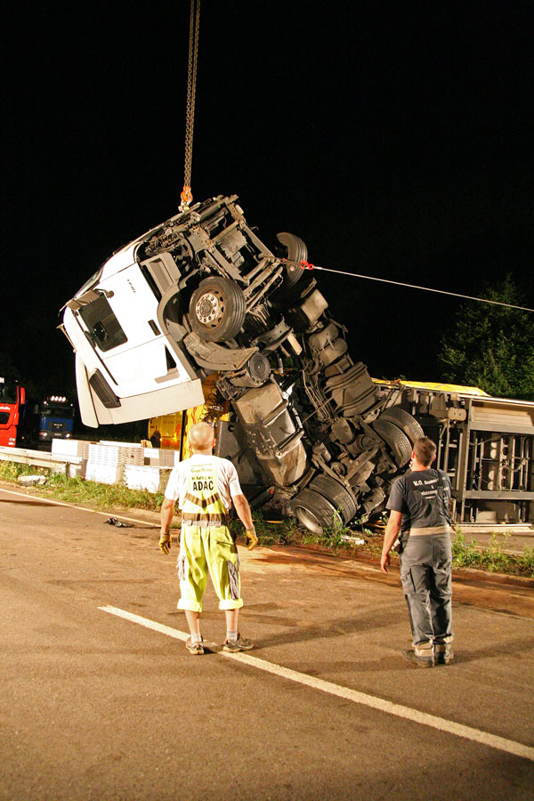 Der Fahrer hatte dabei großes Glück: Er konnte sich unverletzt und aus eigener Kraft aus dem Führerhaus, das senkrecht in den Himmel ragte, befreien. Der Fahrer eines entgegenkommenden Lastzugs erkannte die Situation schnell und konnte rechtzeitig vor der Unfallstelle zum Stehen kommen. Weitere Fahrzeuge wurden nicht in den Unfall verwickelt.