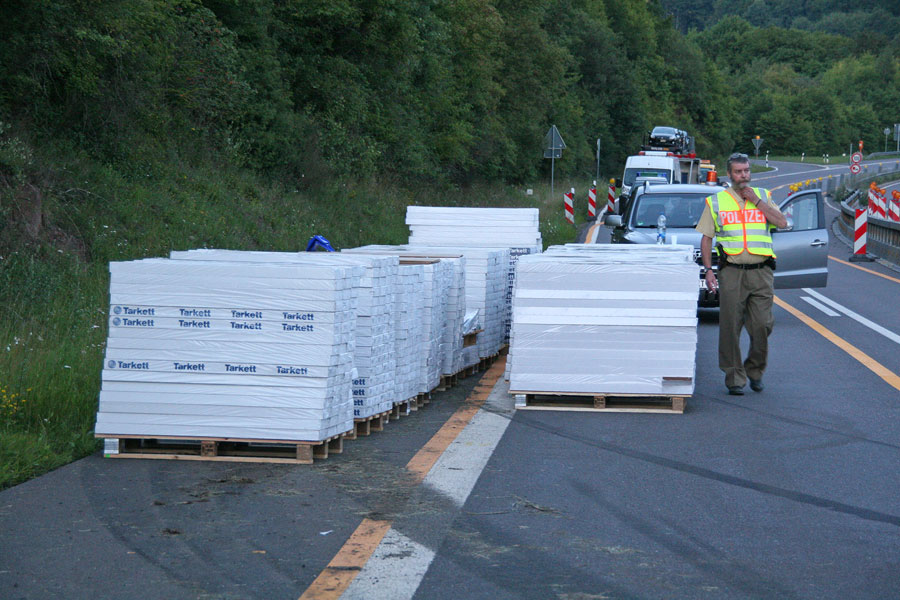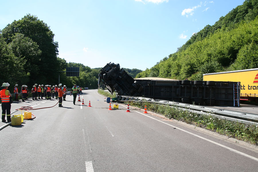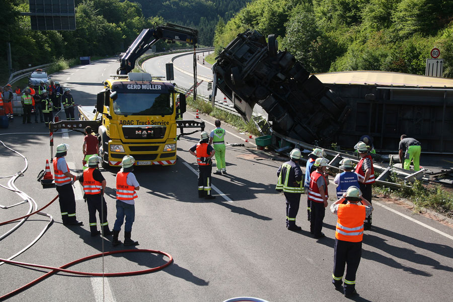 An der Zugmaschine und dem Auflieger entstand Totalschaden. Der Sachschaden beläuft sich einem Gutachter zufolge auf mindestens 100.000 Euro. Die Autobahn 1 musste zwischen den Anschlussstelle Eppelborn und Tholey in beide Fahrtrichtungen bis in die frühen Morgenstunden gesperrt bleiben. Die Feuerwehr war mit 31 Einsatzkräften bis in den frühen Morgen im Einsatz.