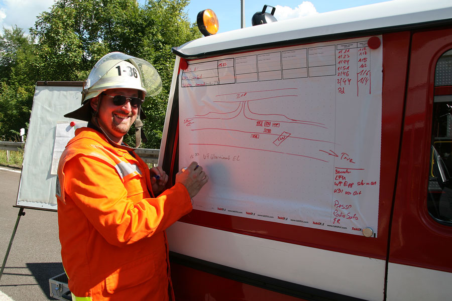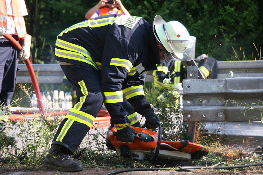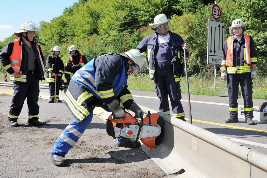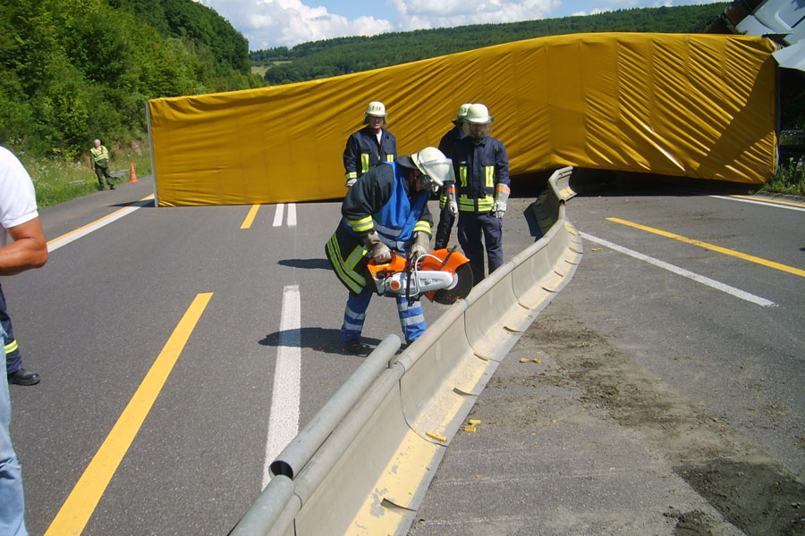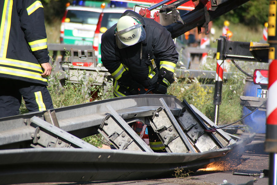 Die Einsatzkräfte unterstützten das Bergungsunternehmen dann bei der Demontage der Leitplanken im Unfallbereich. Dazu mussten die Pfosten mit dem Motortrennschleifer durchtrennt werden. Da bei den Schneidarbeiten wegen dem ausgetretenen Kraftstoff Brandgefahr bestand, wurde die Einsatzstelle mit mehreren Rohren durch die Feuerwehr gesichert.