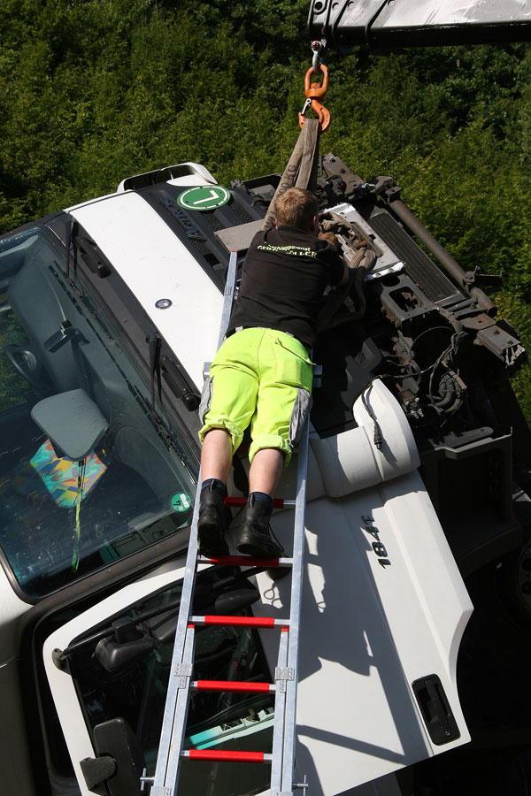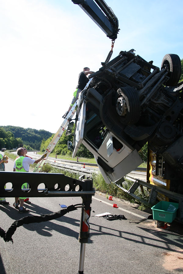[right][cmsimg]3855[/cmsimg][/right]Um das Fahrzeug aufzurichten wurde ein 80t-Kran zur Einsatzstelle angefordert. Damit und unterstützt durch mehrere Seilwinden konnten Zugmaschine und Auflieger dann wieder auf die Räder gestellt werden.