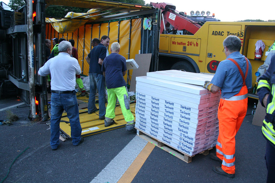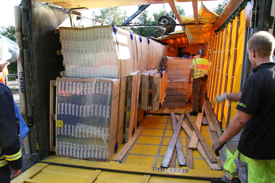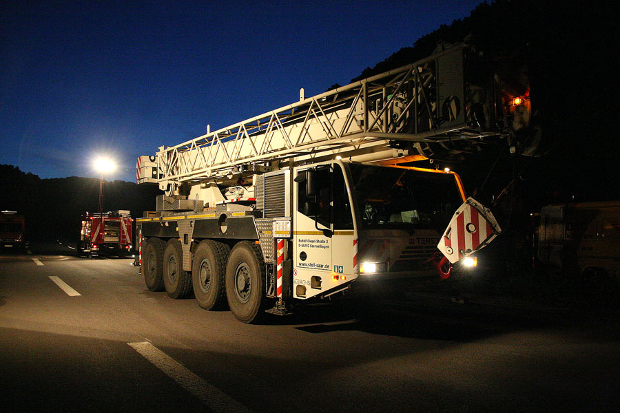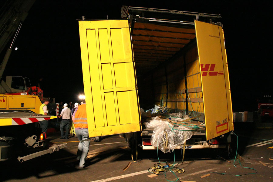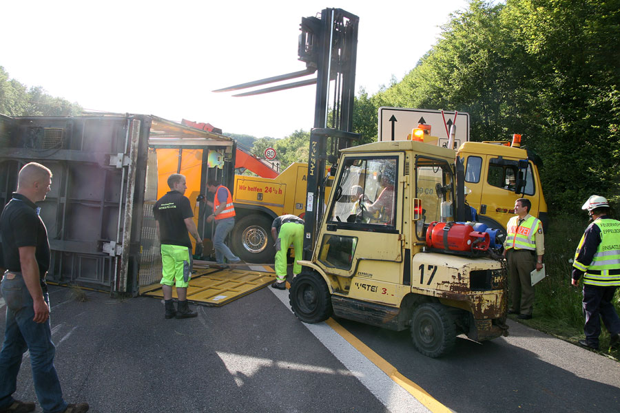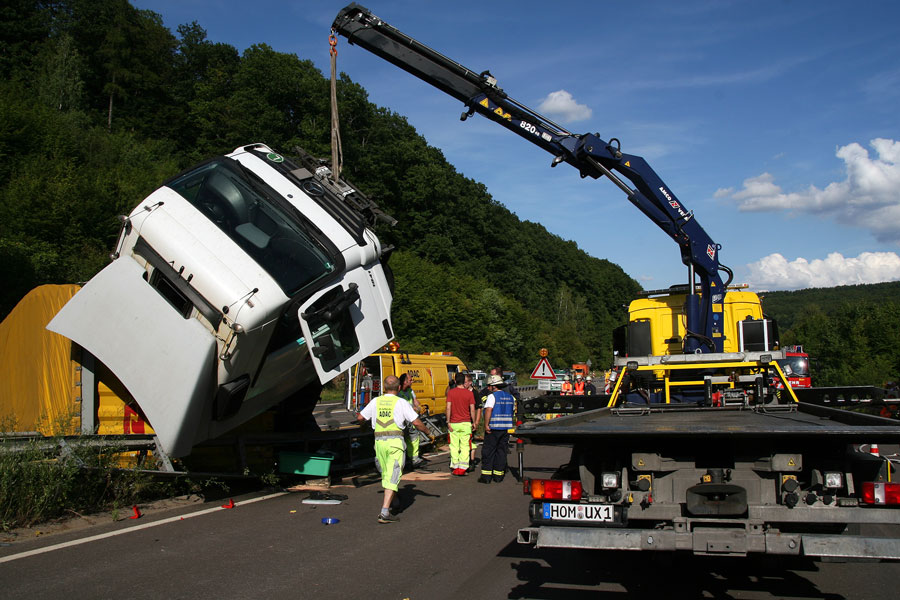 Die anschließende Bergung erwies sich als sehr zeitaufwändig: Bevor das Fahrzeug wieder aufgerichtet werden konnte, musste der Auflieger zuerst entladen werden. Dies ging nur in mühevoller Handarbeit, bei der Paket für Paket nach draußen gebracht wurde und dort wieder auf Paletten gestapelt werden konnte. Da sich die Bergungsarbeiten durch die einsetzende Dunkelheit erschwerten, wurde die Feuerwehr im Amtshilfe noch zur Ausleuchtung eingesetzt. Unterstützung kam dabei in Form eines Beleuchtung-Gerätewagens der Bereitschaftspolizei aus Saarbrücken.