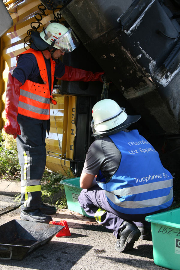 [right][cmsimg]3835[/cmsimg][/right]Die alarmierte Polizei erkannte nach dem Eintreffen, dass Dieselkraftstoff aus dem verunfallten Zugfahrzeug austrat und forderte die Feuerwehr zur Unterstützung an. Die Löschbezirke Eppelborn und Bubach-Calmesweiler wurden gegen 15:27 Uhr über Funkmeldeempfänger alarmiert.