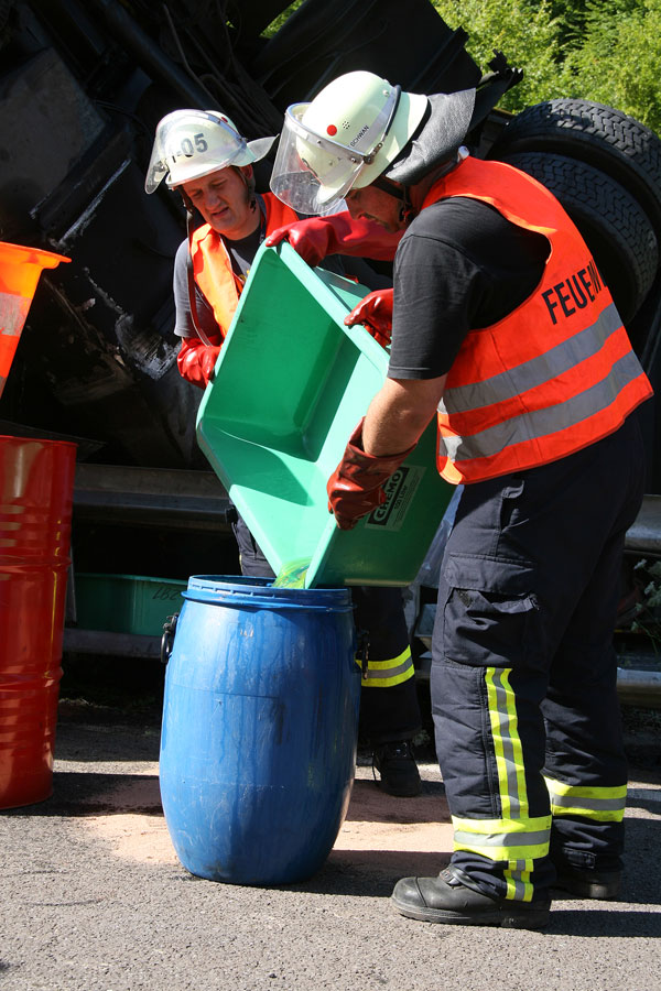 [left][cmsimg]3848[/cmsimg][/left]Der beschädigte Dieseltank des Unfallfahrzeugs, aus dem weiterhin Kraftstoff austrat, musste entleert und der austretende Dieselkraftstoff aufgefangen werden.