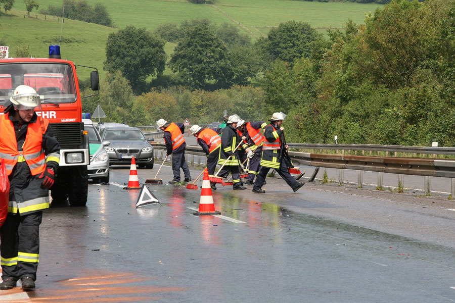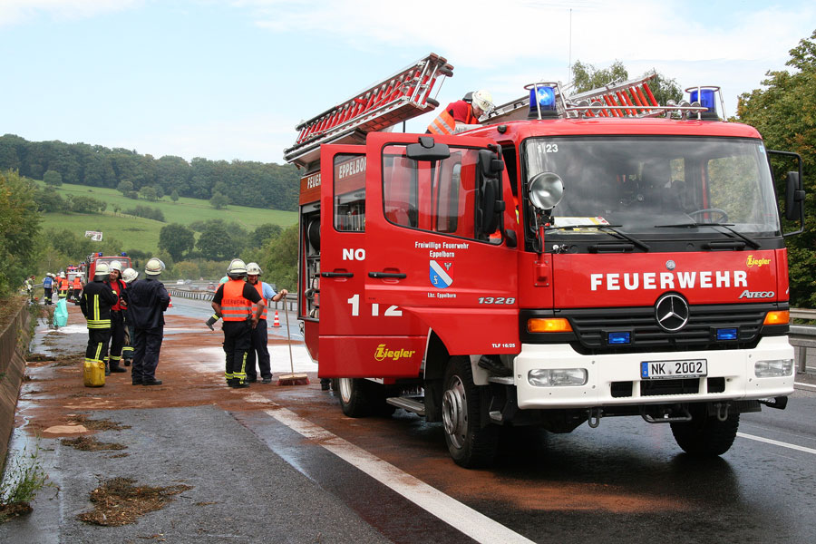 Da aus dem Unfallfahrzeug Betriebsstoffe austraten, wurden die Feuerwehr Eppelborn gegen 12:36 Uhr von der Polizei angefordert. Die Einsatzkräfte sicherten die Unfallstelle gemeinsam mit den Beamten der Polizei gegen den fließenden Verkehr und streuten die ausgelaufenen Betriebsstoffe mit Bindemitteln ab. Zusätzlich mussten Trümmerteile des Fahrzeugs von der Fahrbahn entfernt werden. Die Unfallstelle wurde an Polizei und Autobahnmeisterei übergeben.