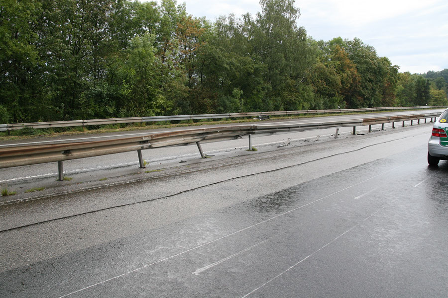 Ein mit zwei Personen besetztes Fahrzeug geriet am 21. August 2011 gegen Mittag auf der Autobahn A1 zwischen den Anschlussstellen Eppelborn und Illingen auf regennasser Fahrbahn ins Schleudern, prallte in die Mittelleitplanke und kam mitten auf der Fahrbahn zum Stehen.