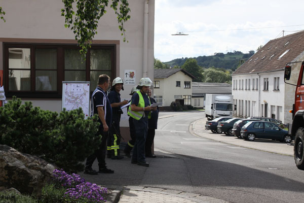 [b]Eppelborn.[/b] Es muss wohl ein heftiges Unwetter gewesen sein, das über Eppelborn hinweg gezogen ist. Nach mehreren Blitzeinschlägen steigt dichter Rauch aus dem neuen Fettsprühturm der Firma Juchem. Das war die brenzlige Ausgangssituation bei der Jahreshauptübung der Wehr am Samstag. Kurz nach dem Alarm erreichen die ersten Fahrzeuge die Übungsstelle und erkunden die Situation. Menschen sind im Inneren der Produktionsanlage von Flammen und Rauch eingeschlossen. Sofort kämpft sich ein Trupp mit Atemschutzgeräten durch die Nebelschwaden. Ein weiterer Rettungstrupp eilt zur Unterstützung herbei. Eine Tür muss aufgebrochen werden, um weiter vorzudringen. Und endlich: Ein vermisster Arbeiter kann aus dem Feuer gerettet werden. Die Männer der beiden Trupps sind erschöpft, denn es sind knapp 30 Grad. Das Löschwasser für die Brandbekämpfung muss aus der Ill gepumpt werden. Schläuche werden verlegt und winden sich über einige hundert Meter durch die Industriefläche.
