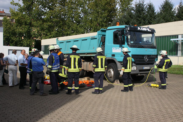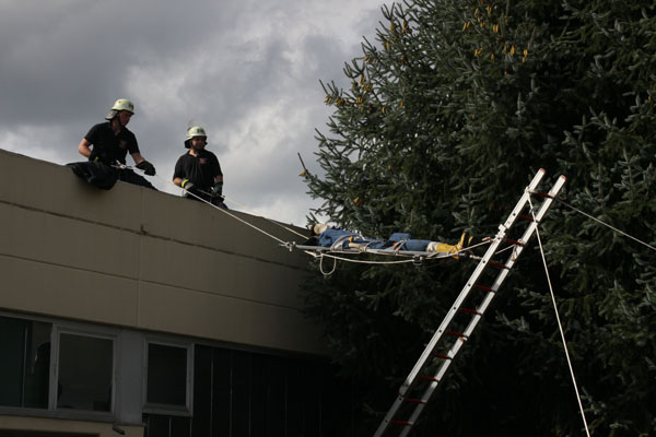 Doch diese Aufgabe war den Planern der Großübung noch nicht genug. In einem anderen Teil des Industriegebietes wird durch den starken Regen während des Unwetters der Boden so stark aufgeweicht, dass ein Lkw umkippt und der Fahrer unter dem Kipper eingeklemmt wird. Die Helfer müssen ihn mit Luftkissen aus seiner misslichen Lage befreien. Auch das gelingt schnell und reibungslos. In der dritten Übungsszene muss eine verletzte Person mit einer speziellen Rettungstechnik von einem Dach gerettet werden. Festgezurrt auf einer Trage und gesichert mit einem Gespinst aus Leinen, konnte die Übungspuppe mit dem wackeligen Konstrukt problemlos