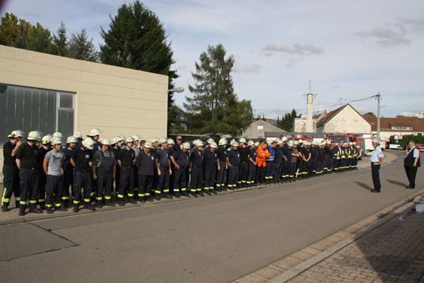 Noch während die Helfer rund um den Einsatzleiter Eric Holzer mit ihren Übungsaufgaben beschäftigt waren, wurde die Reserveeinheit der Wehr zu einem echten Einsatz gerufen. Anwohner der "Wiesbach" in der Schloßstraße meldeten sich bei der Polizei und teilten mit, dass ein Ölfilm auf dem Gewässer zu sehen sei. Auch diesen echten Einsatz hatten die Helfer schnell im Griff. Mit speziellen Ölsperren und Bindemittel konnte das Öl aufgefangen werden und somit weitere Umweltschäden vermieden werden. Ein dickes Lob gab es nach der Übung vom Chef der Wehr Bürgermeister Fritz-Hermann Lutz. Er hatte sich alle Übungsteile genau angesehen und sich von Wehrführer Recktenwald erklären lassen. "Was ich hier gesehen habe, war sehr gut" so der Verwaltungschef bei der anschließenden Besprechung im Big Eppel. Auch Wehrführer Recktenwald zeigte sich mit der Arbeit seiner Kameraden sehr zufrieden. An der Übung beteiligen sich 130 Wehrleute mit 13 Fahrzeugen.