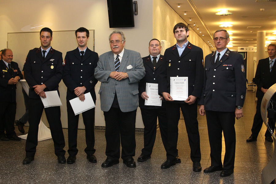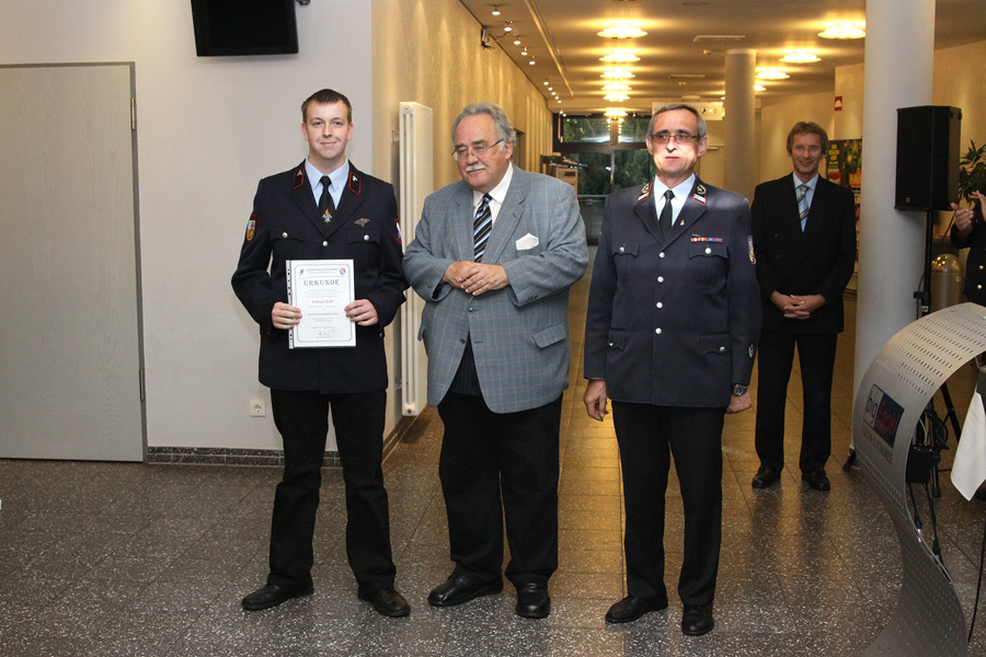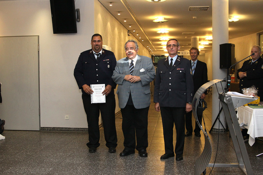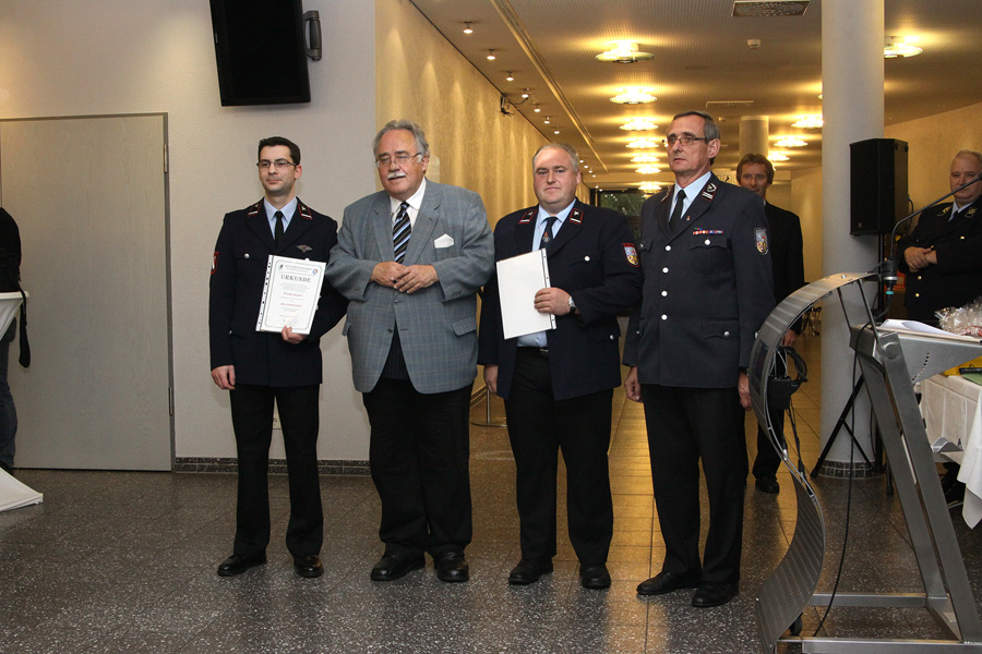 Auf Einladung des Chefs der Wehr, Bürgermeister Fritz-Hermann Lutz, kamen am Freitag, den 23. September 2011 zahlreiche Wehrleute, Vertreter der Ortsteile sowie der Gemeinde im big Eppel zum alljährlichen Ehrungsabend der Freiwilligen Feuerwehr Eppelborn zusammen. In der traditionellen, gemeinsamen Feierstunde im Foyer von big Eppel konnte Bürgermeister Lutz in diesem Jahr fünf Nachwuchsfeuerwehrleute aus der Jugendwehr in die aktive Wehr aufnehmen. Insgesamt 17 Wehrleute wurden zum Feuerwehrmann, Oberfeuerwehrmann, Löschmeister, Oberlöschmeister, Hauptlöschmeister, Brandmeister und Oberbrandmeister befördert. Neben den Beförderungen wurden dem Löschbezirksführer des Löschbezirkes Wiesbach, Günther Neu, sowie den stellvertretenden Löschbezirksführern der Löschbezirke Wiesbach, Stephan Rein, und Dirmingen, Markus Lambert, jeweils ihre Ernennungsurkunden ausgehändigt. Für ihr langjähriges Engagement im Dienste der Freiwilligen Feuerwehr wurden für 20 Jahre aktiven Dienst sechs Feuerwehrkameraden, für 40 Jahre aktiven Dienst drei Kameraden geehrt. Im Namen des Innenministers Stephan Toscani verlieh Kreisbrandinspekteur Werner Thom vier Feuerwehrkameraden für 25-jährigen aktiven Dienst in der Eppelborner Wehr das silberne Feuerwehrehrenzeichen am Bande. Für 35-jährige aktive Zugehörigkeit zur Eppelborner Wehr wurde einem Feuerwehrmann das goldene Feuerwehrehrenzeichen am Bande durch den Kreisbrandinspekteur verliehen. Erstmalig konnte auch Landesstabführer Günter Schmitt an diesem Abend drei Mitglieder des Fanfarenzuges Eppelborn für ihre langjährige Mitgliedschaft im Fanfarenzug Eppelborn auszeichnen und ehren. [left][cmsimg]3992[/cmsimg][/left]Allen geehrten Feuerwehrmännern und -frauen sprachen Bürgermeister Fritz-Hermann Lutz, Wehrführer Hermann-Josef Recktenwald, Kreisbrandinspekteur Werner Thom sowie die Ortsvorsteher ihren besonderen Dank aus für die vielen ehrenamtlichen Einsätze, die die Wehrleute geleistet haben und noch leisten werden. Anlässlich seines 90-jährigen Bestehens wurden am Samstag, dem 24.09.2011 durch den Ersten Beigeordneten der Gemeinde Eppelborn, Berthold Schmitt, in Vertretung für den Chef der Wehr, Bürgermeister Lutz im Rahmen der im Pfarrsaal Humes stattgefundenen Feierlichkeiten zwei weitere Nachwuchsfeuerwehrleute von der Jugendwehr in den aktive Feuerwehrdienst übernommen. Ebenso wurden drei Beförderungen, je eine Ehrung für 20-jährige und 40-jährige Mitgliedschaft vorgenommen. Dem stellvertretenden Löschbezirksführer Patrik Behr wurde zudem von Kreisbrandinspekteur Werner Thom das silberne Feuerwehrehrenzeichen am Bande für seine 25-jährige aktive Mitgliedschaft verliehen.