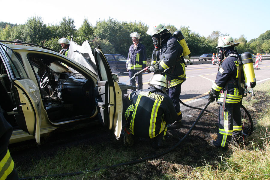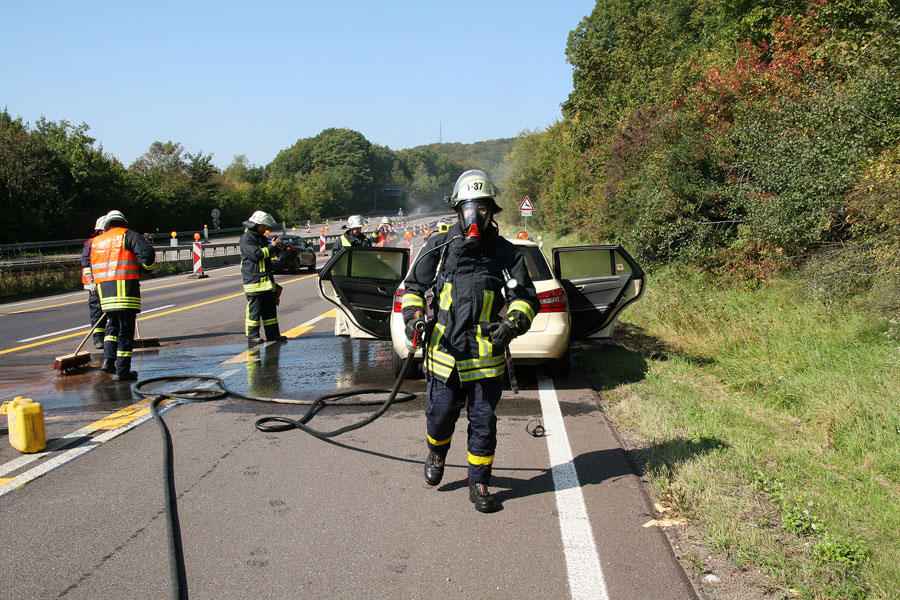 Gegen 11:47 Uhr wurden die Löschbezirke Bubach-Calmesweiler und Eppelborn sowie die Polizei mit dem Stichwort "Fahrzeugbrand" alarmiert. Die ersten Einsatzkräfte fanden ein brennendes, auf dem Standstreifen stehendes Fahrzeug vor. Die gesamte Motorpartie des Wagens stand in Brand, die Flammen hatten bereits auf den Innenraum übergriffen. Auch der Grünstreifen war durch die große Hitze im Bereich der Einsatzstelle in Brand geraten. Die Fahrerin war unverletzt.