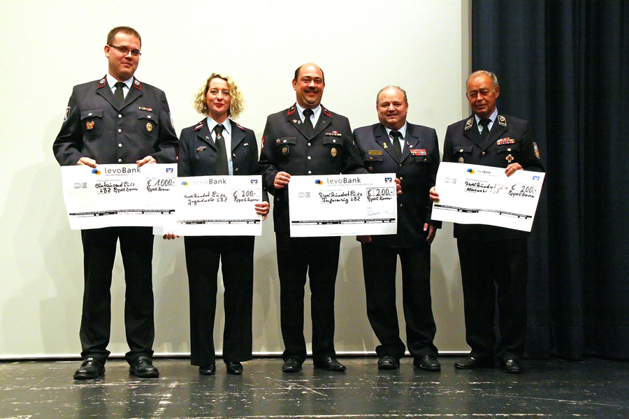 [left][cmsimg]4041[/cmsimg][/left]Der Vorsitzende des Fördervereins Günter Schmitt hatten für die neu in die Einsatzabteilung übernommenen Kameraden noch eine Überraschung: Sie erhielten als Willkommensgeschenk das Lehrbuch "Feuerwehr-Grundlehrgang" und einen Schlauchhalter zum Knoten üben. Ausserdem überreichte der Förderverein Schecks zur Unterstützung der Feuerwehrarbeit: Je 200 Euro erhielten Jugendfeuerwehr, Alterswehr und Fanfarenzug, weitere 1.000 Euro gingen an die Einsatzabteilung des Löschbezirks. Ausserdem wurde in diesem Jahr ein Notebook sowie ein Beamer für Ausbildungszwecke angeschafft und der Feuerwehr zur Verfügung gestellt.