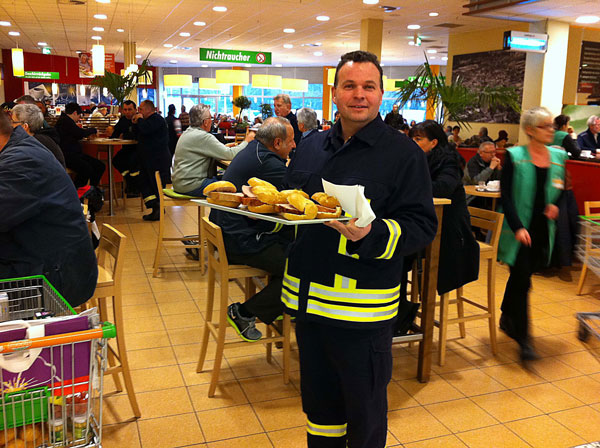 Mit zwei vollbesetzten 9-Sitzern verließ der Löschbezirk gegen 12:00 Uhr die Autobahn in Kaiserslautern, um uns mit einem kräftigen Imbiss für die bevorstehende Besichtigung zu stärken. Denn ohne Mampf kein Kampf, so die Devise, gab es dann frischen warmen Fleischkäse und Frikadellen. So gestärkt konnten die letzten Kilometer angetreten werden.