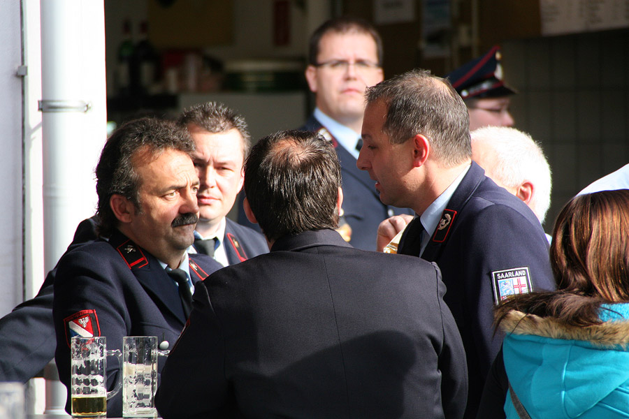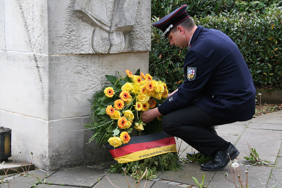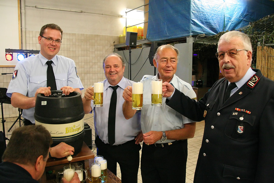 Mit einer Kranzniederlegung am Mahnmal auf dem Eppelborner Friedhof gedachten die Feuerwehrleute zusammen mit Vertretern der DLRG und begleitet vom Fanfarenzug am Samstag Nachmittag den verstorbenen Kameraden, bevor der Festtrubel im Feuerwehrgerätehaus in der Schleidstraße losging. Gekonnt und souverän bewiesen dann die beiden Ehrenlöschbezirksführer Felix Becker und Hans-Jürgen Olliger beim Fassanstich am Abend, dass sie noch nicht zum alten Eisen gehören.