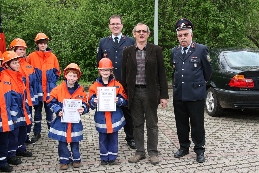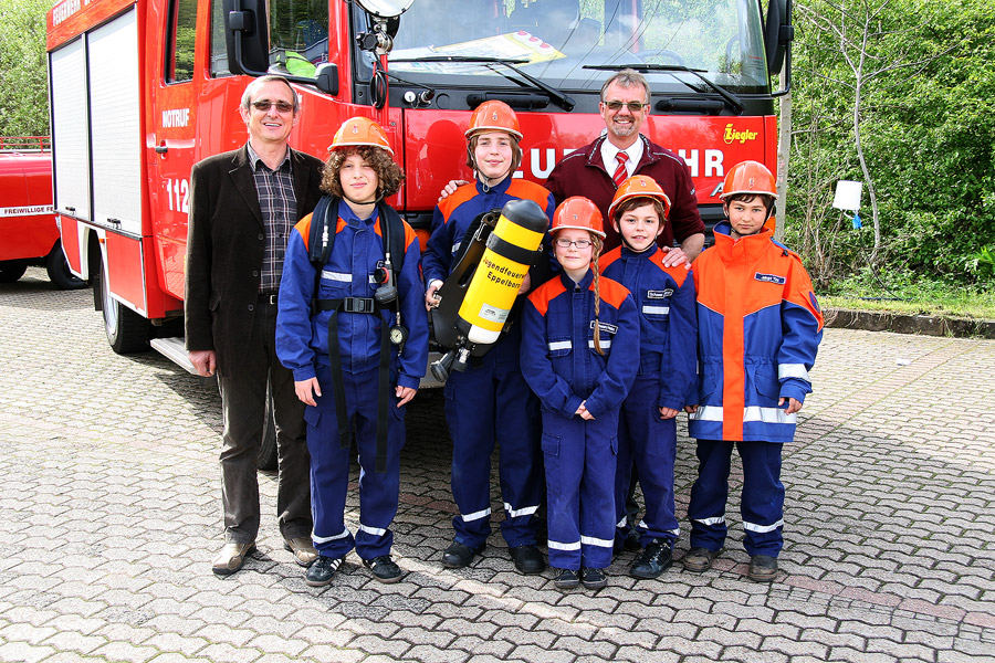 [left][cmsimg]4386[/cmsimg][/left] Dabei konnten auch die beiden Atemschutzgeräte-Attrappen zum ersten Mal eingesetzt werden, die Ralf Freude von der Firma Sicherheitstechnik Wita & Freude am Vortag der Jugendfeuerwehr übergeben hatte. Diese extrem leichten Geräte aus GFK-Kunststoff waren zuvor ausgemustert worden, und können jetzt von der Jugendfeuerwehr bei Übungen genutzt werden. Auch personell erhielt die Jugendfeuerwehr Verstärkung: Wehrführer Hermann Josef Recktenwald nutzte das Feuerwehrfest, um Helen Schwan und Leon Hoffmann als neue Mitglieder aufzunehmen.