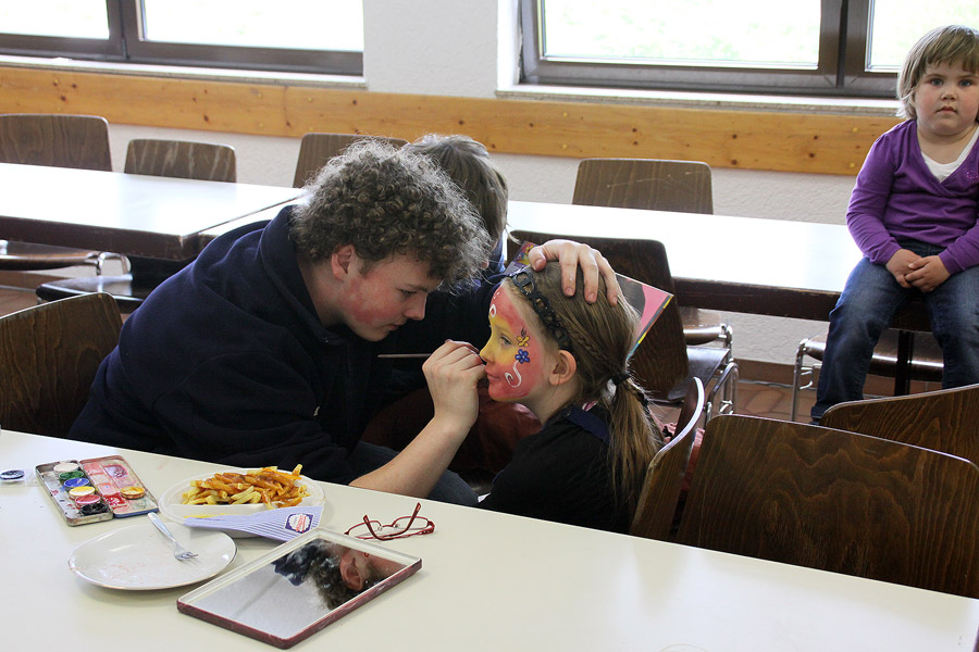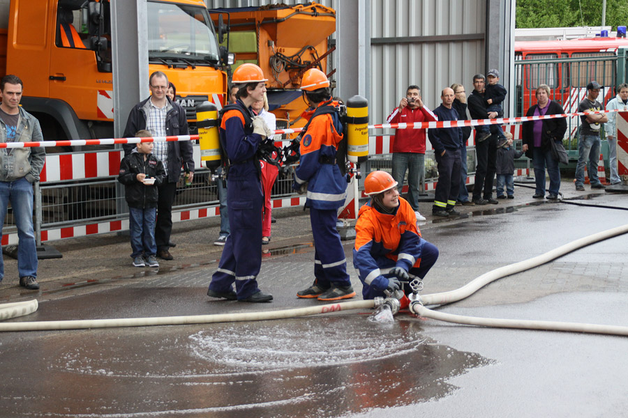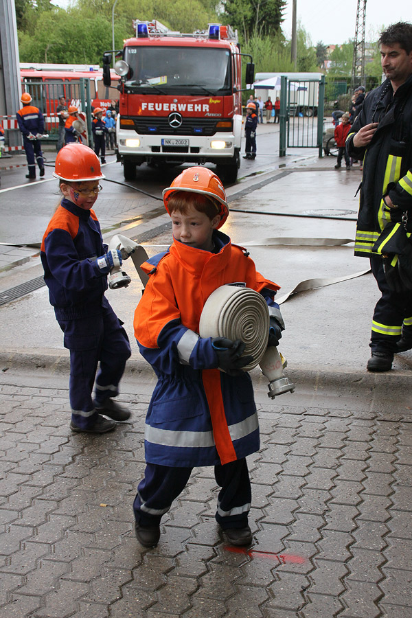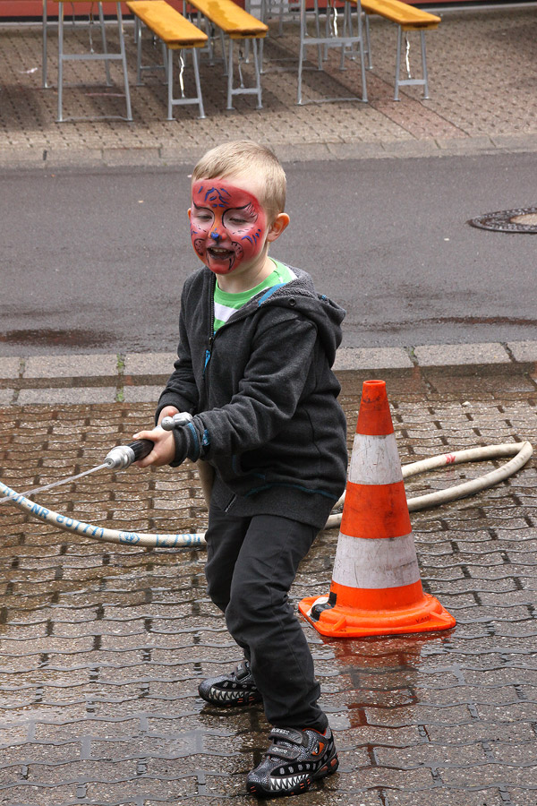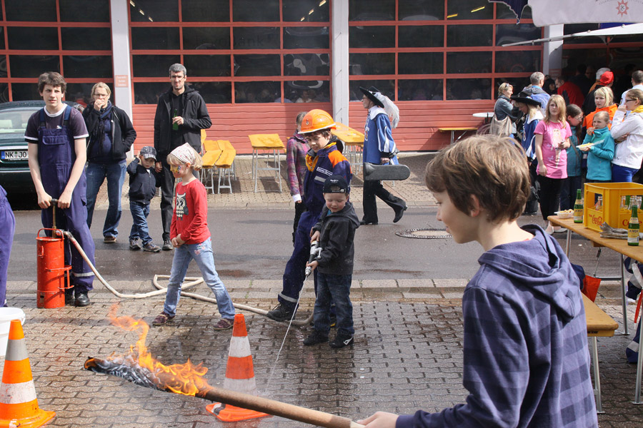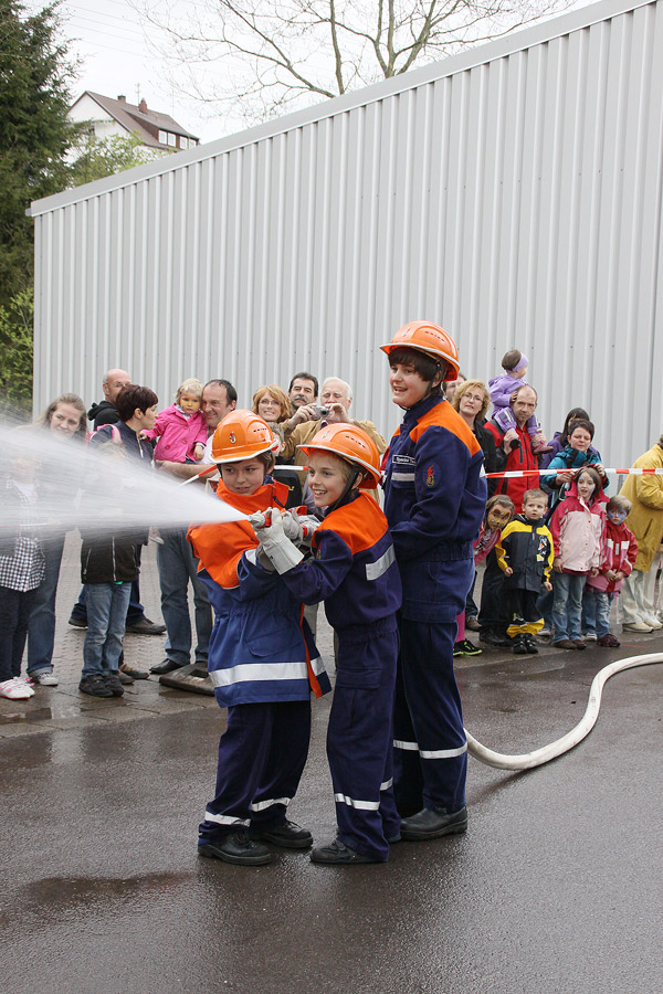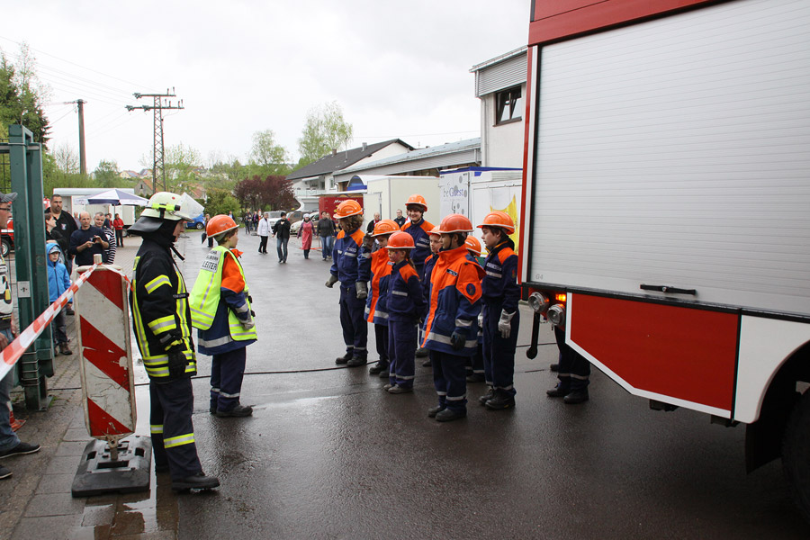 Ein Höhepunkt vor allem für die kleine Besucher war sicherlich auch die Schauübung der Jugendfeuerwehr am Sonntag: Mit Blaulicht und Martinshorn rückten die Jugendlichen an, um ein Holzfeuer vor dem Gemeindebauhof zu löschen. Auch wenn dabei das Wetter nicht immer mitspielte, hatten die Jugendfeuerwehrleute einen riesen Spaß.