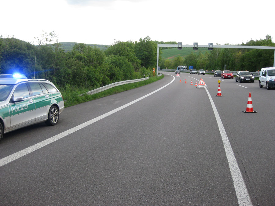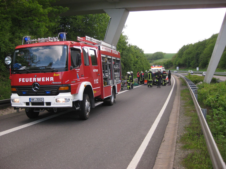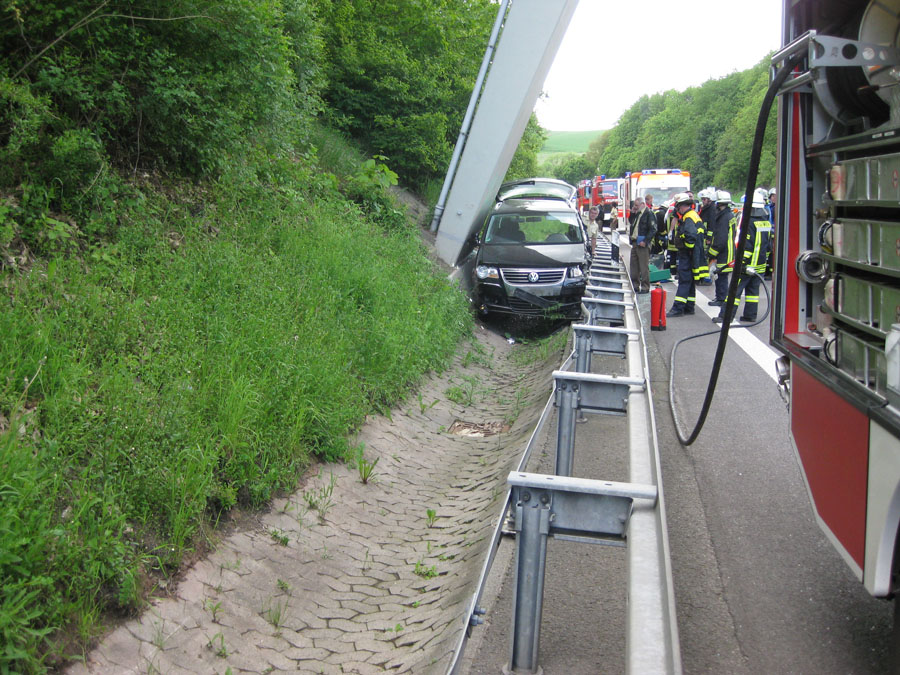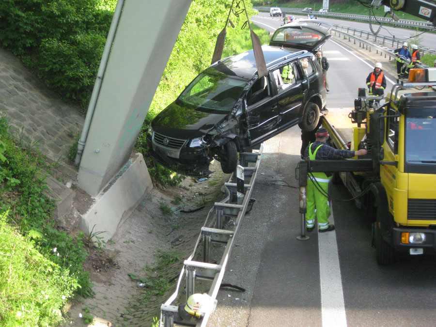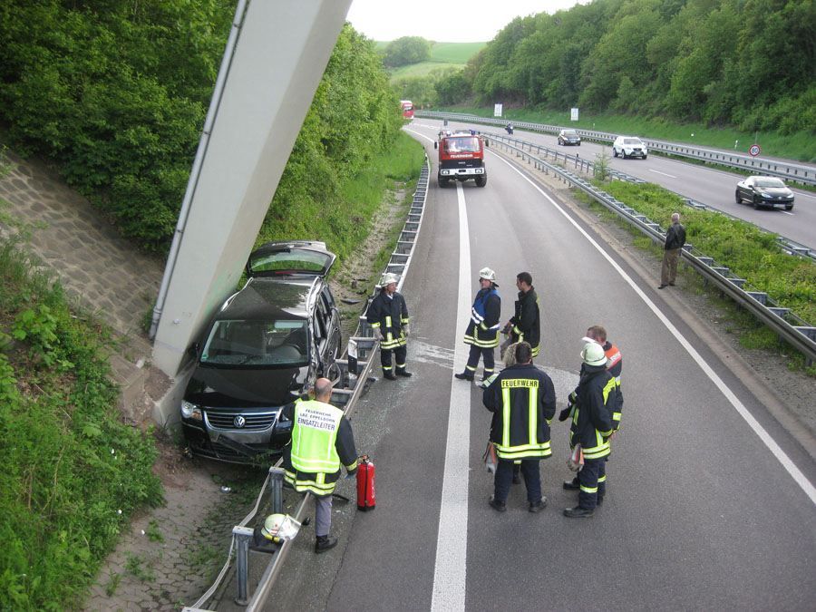 Auf der Autobahn A1 ereignete sich am Nachmittag des 15. Mai 2012 ein schwerer Verkehrsunfall zwischen den Anschlussstellen Eppelborn und Tholey. Die Fahrerin eines VW Touran befuhr die rechte Fahrspur der dort dreispurig verlaufenden Autobahn in Richtung Trier, als sie in Höhe einer Brücke aus noch ungeklärter Ursache nach rechts von der Fahrbahn abkam. Das Fahrzeug rutschte über die Leitplanken und landete genau zwischen einem Brückenpfeiler und den Leitplanken. Dabei verkeilte sich das Fahrzeug derart unglücklich, dass sich die Fahrzeugtüren nicht mehr öffnen ließen. Der nur leicht verletzten Fahrerin gelang es, aus eigener Kraft in den Kofferraum zu klettern, wo sie durch Ersthelfer betreut wurde. Gegen 17:35 Uhr wurden Polizei, Rettungsdienst und die Feuerwehren aus Eppelborn und Bubach-Calmesweiler alarmiert. Rettungsassistenten der Feuerwehr übernahmen die weitere medizinische Versorgung der Fahrerin bis zum Eintreffen des Notarztes. Die Unfallstelle wurde in Absprache mit der Polizei gesichert und die rechte Fahrspur gesperrt und der Brandschutz mit Feuerlöschern und der Schnellangriffseinrichtung des Tanklöschfahrzeugs sichergestellt. Zusammen mit dem Rettungsdienst konnte die Frau dann schonend aus dem Fahrzeug befreit werden. Die Feuerwehr blieb noch bis zum Ende der Bergungsarbeiten zur Unterstützung des Bergungsunternehmens an der Einsatzstelle. Der Einsatz war für die Einsatzkräfte gegen 19:00 Uhr beendet. Ein Gutachter soll nun klären, ob die Stabilität der Brücke in Mitleidenschaft gezogen wurde.