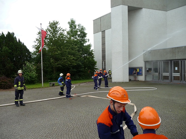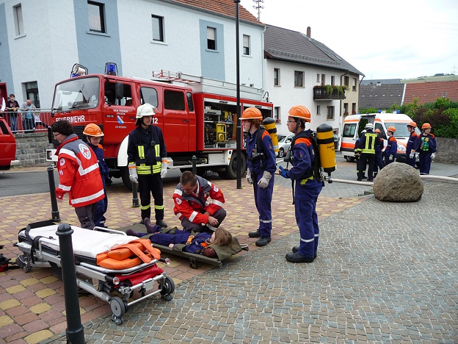 Auch bei der Jugendfeuerwehr muss zuerst fleißig geübt und trainiert werden, bevor man das erlernte so gekonnt zur Schau zu stellen vermag, wie dies an den Kulturtagen 2012 in Wiesbach zu sehen war. Die Schauübung mit realen Einsatzbedingungen ließ zu Beginn die Anspannung bei unseren Nachwuchskräften sprunghaft ansteigen, bevor diese im Rahmen der gemeinsam gelösten Aufgabe dem Spaß und der Erleichterung über den Erfolg der Übung wisch. Die Aufgabe begann am Sonntagnachmittag mit einem Sirenenalarm. Bereits auf der Einsatzfahrt mit Martinshorn wurde gemeldet, "Brandalarm, mehrere verletzte Personen von Feuer bedroht, Einsatz von Atemschutztechnik erforderlich." Nach Erreichen der Einsatzstelle konnte, unter Leitung der stellvertretenden Jugendwartin Eva-Maria, sofort mit den erforderlichen Erstmaßnahmen, d. h. Menschenrettung und Sicherstellen der Wasserversorgung begonnen werden. Den zahlreichen interessierten Zuschauern wurde gekonnt dargestellt, wie zielstrebig und begeistert bereits der Nachwuchs bei der Feuerwehr arbeitet. Als unter Führung des Gruppensprechers Leon die Verletzten an die Sanitäter des roten Kreuzes übergeben wurden, war bereits eine gewisse Erleichterung in den Gesichtern der Jugendlichen erkennbar. "Es hat wiedermal richtig Spaß gemacht", war schließlich auch die einhellige Meinung der 11 jugendlichen Akteure aus Wiesbach und Humes. Wir, die Organisatoren und Verantwortlichen für die Jugendarbeit bei der Wiesbacher Feuerwehr möchten uns ganz herzlich bei den Gästen der Kulturtage für das gezeigte Interesse bedanken. Wir würden uns freuen, interessierte Zuschauer auch einmal im Rahmen unserer Übungstermine begrüßen zu können, um mögliche Fragen zum Thema Jugendfeuerwehr oder Feuerwehrtechnik beantworten zu können. Sie treffen uns bei unseren Übungen, welche außerhalb der Ferien stattfinden.