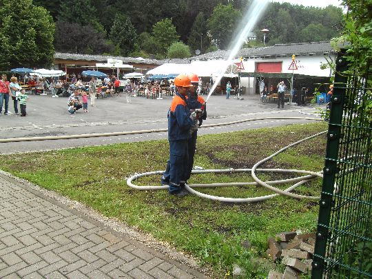 Das Nachtwache-Team Rudi und David Spindler, wurden vom Erbsensuppen-Küchen-Team, morgens um 6 Uhr abgelöst und konnten Ihrem verdienten Schlaf entgegeneilen. An dieser Stelle sei der Nachtwache für Ihren guten Job gedankt. Der Fanfarenzug Spiesen-Elversberg fand sich vormittags ebenfalls ein, um mit flotten Rhytmen die Frühschopper zu begeistern. Wie schon am Tage zuvor war tolles Wetter und die Besucher blieben trocken. Das Mittagessen nahte und der Andrang war groß an den Essensständen. Ein Beweis dafür, dass die Qualität und die Sauberkeit bei der Feuerwehr aus Dirmingen GROß geschrieben wird. Es war nicht zu heiß und so blieben viele Gäste über Mittag einfach sitzen und ließen sich dann gegen 16 Uhr von einer Schauübung der Jugendfeuerwehr begeistern. Auch der Gemeinde-Jugendwart Karl Paul war gekommen und schaute den jungen Feuerwehrleuten aus Dirmingen bei Ihrer Übung zu. Guido Kuhn, der Jugendwart, gibt sich immer viel Mühe die Übungen vorzubereiten und durchzuführen. Mittlerweile waren unsere Freunde aus Pfaffenthal in Luxemburg auch eingetroffen. Zwischen den Feuerwehrleuten aus Pfaffenthal und uns besteht schon viele Jahre eine gute Freundschaft. Es wurde ein sehr schöner Nachmittag, dem sich ein gemütlicher Abend anschloss. Ab 22 Uhr wurde angefangen abzubauen und die restlichen Gäste versammelten sich um den Bierstand, gerade noch rechtzeitig um nicht nass zu werden, denn es gab einen sintflutartigen Regenfall. Die Floriansjünger hatten viel Glück, dass der Regen erst nach dem Abbau einsetzte.